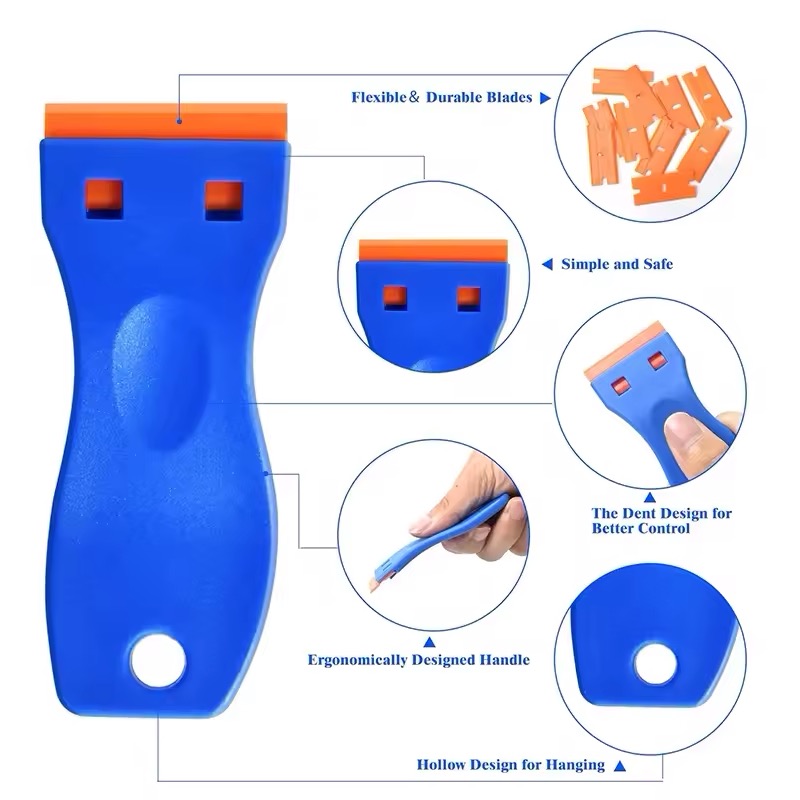 Safety clean glass without scratching surface. Use the razor blade tool to meet all your scraping and cleaning needs, as well as plastic blades , it's safer for your fingers and surfaces.