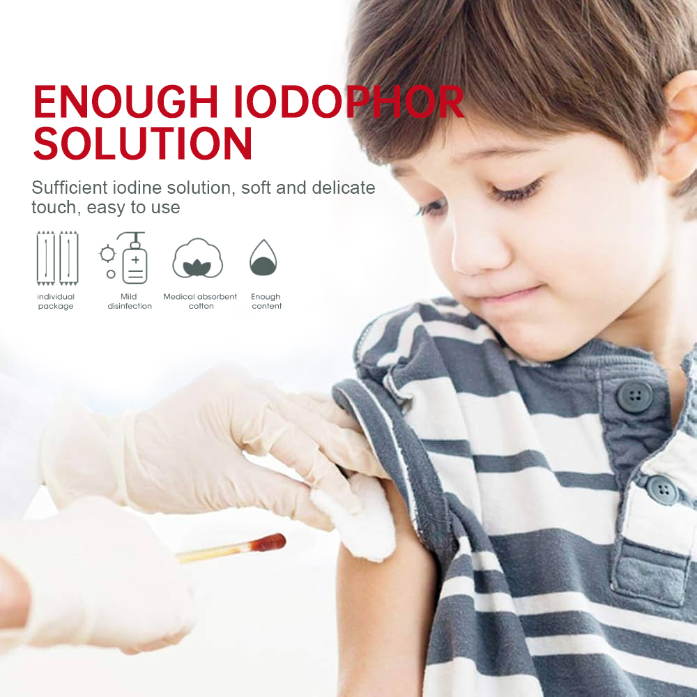 Material: Iodine swabs consist of povidone iodine solution, soft cotton swab head and plastic stick. Povidone-iodine cotton swabs are less irritating to the skin, safe and easy to use. Made of high-quality cotton, soft and comfortable to touch, can be used by adults, children and pets