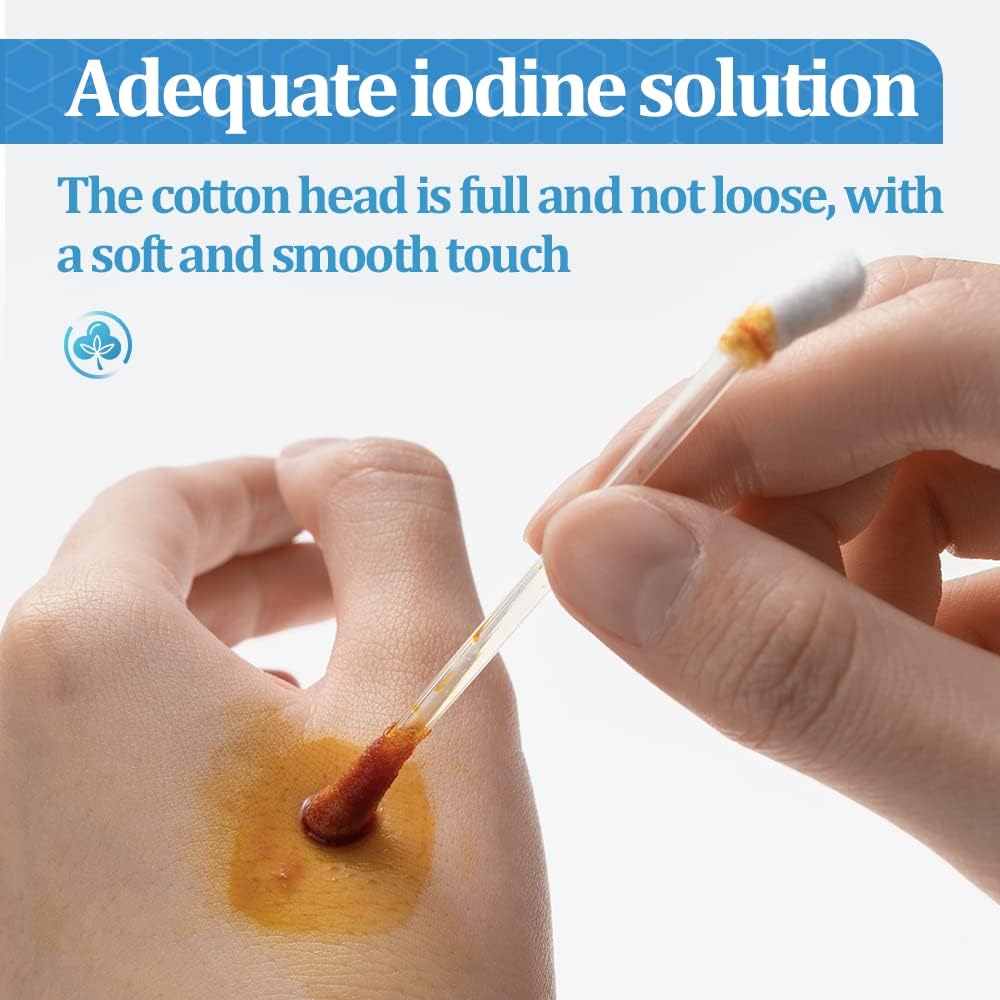 Easy to Use: Double-ended design, very easy to use. Take out the disposable iodine swabs, break the color ring position, the iodide solution flows down, soak the swabs, and apply it to the skin wound position can be