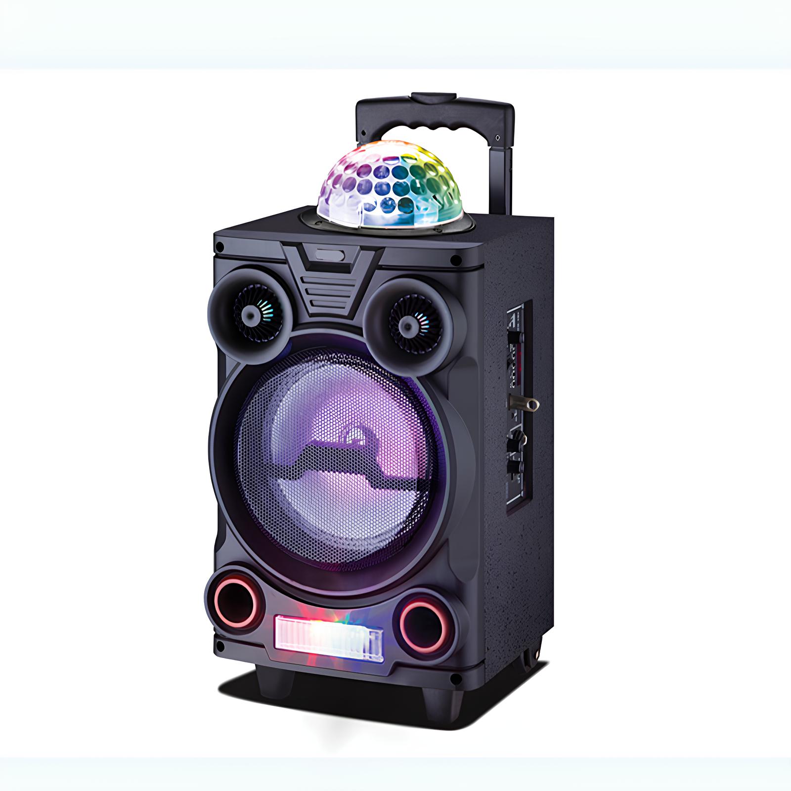 Powerful Audio & Lighting: 20,000 watts with an 8-inch main speaker, two 3-inch speakers, disco ball lights on top, and RGB projector lights at the bottom.