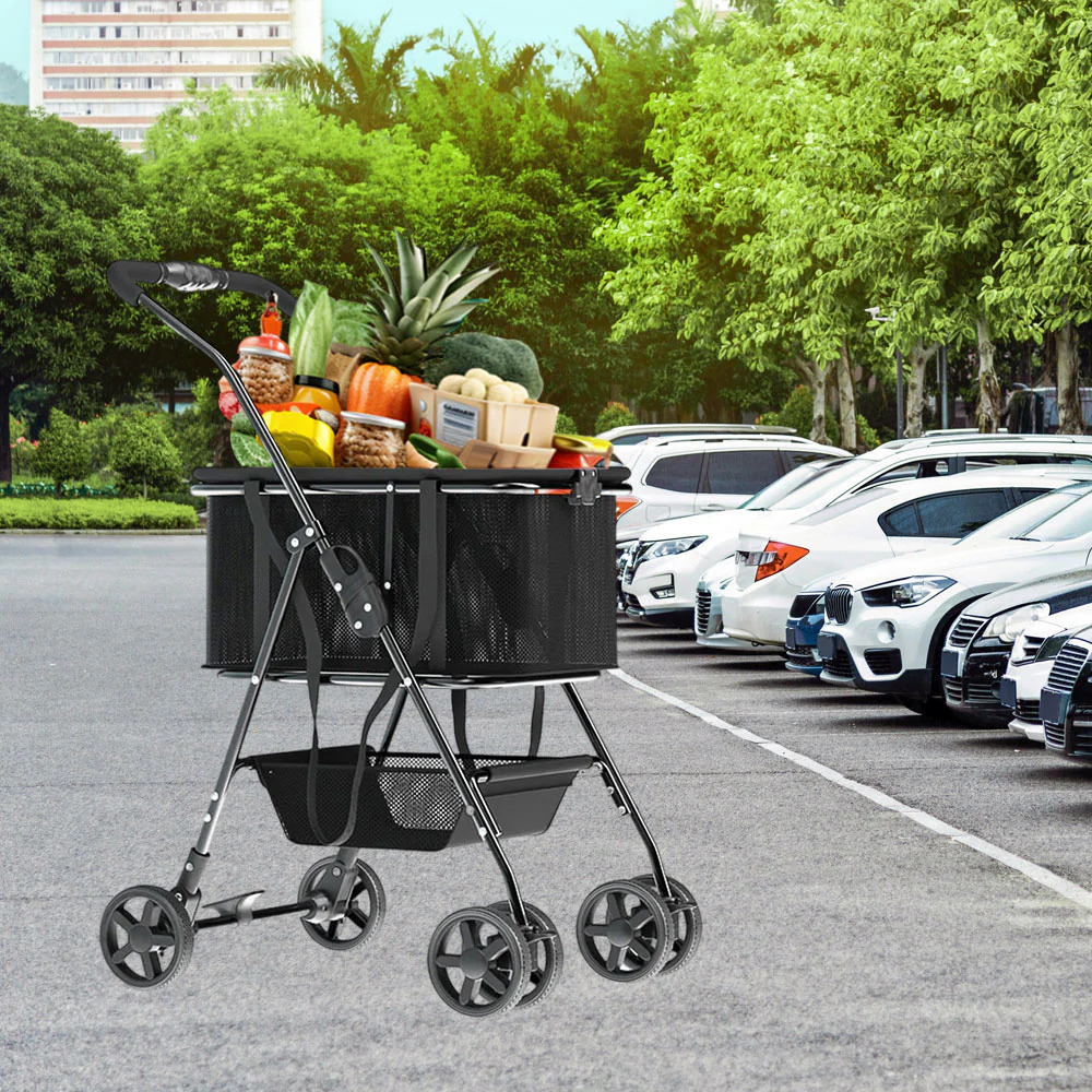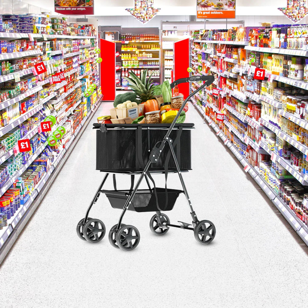 Heavy Duty Construction: This shopping cart is carefully crafted with rust-resistant metal construction and thick nylon mesh basket storage, making it durable and long-lasting for constant and frequent use.