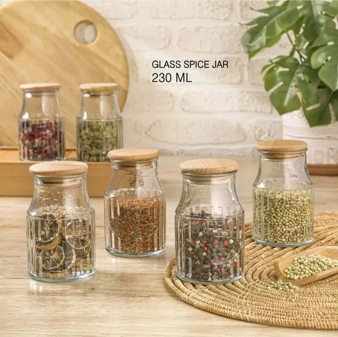 Stylish & Practical: Glass spice jars with wooden lids, perfect for organizing your kitchen.