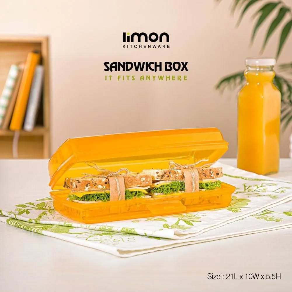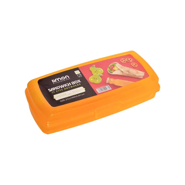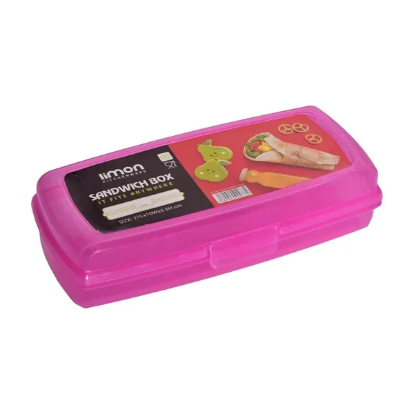 Compact Design: Sandwich container (21x10x5.5 cm) in vibrant colors – pink, blue, yellow, and orange.