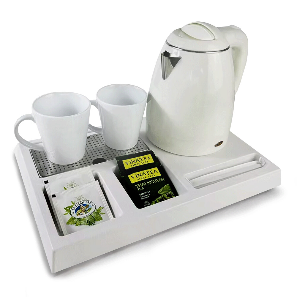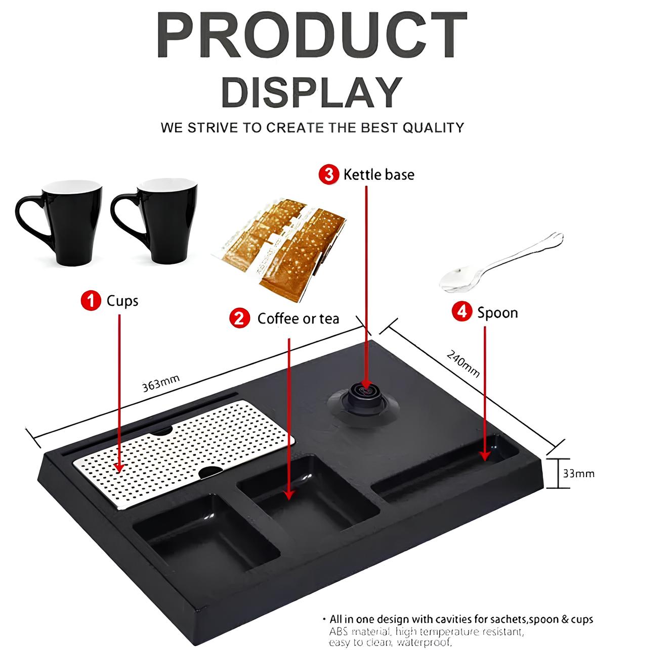 Multifunctional Base – 360° rotating base with dedicated space for 2 cups, tea bags, coffee, and sugar.