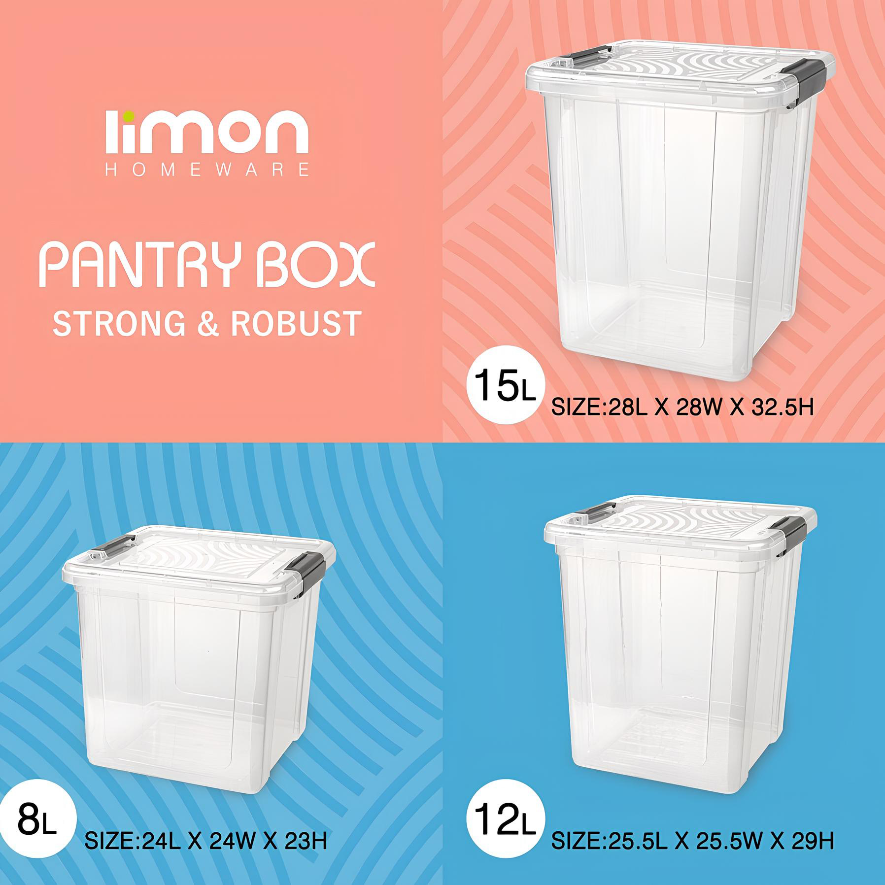 Available in Three Convenient Sizes – The pantry box comes in 8L, 12L, and 15L capacities, catering to various storage needs. Whether you need a compact option for small ingredients or a larger container for bulk storage, there’s a size for you.