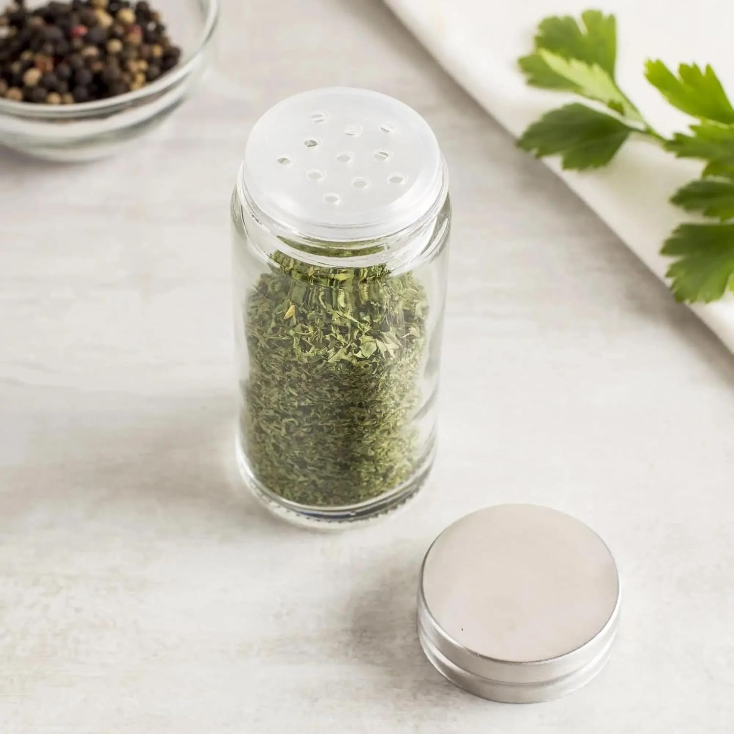 Removable Sifter Caps: The spice rack features removable sifter caps that allow you to evenly dispense spices with minimal mess, making it simple to pour into measuring spoons or directly onto your food.