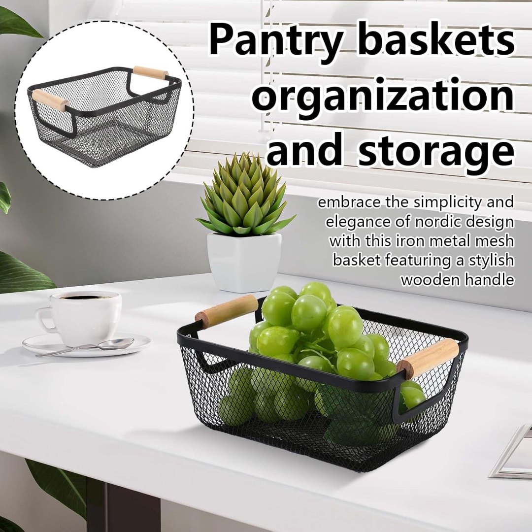 Premium Material & Perfect Size – Made from sturdy black metal mesh with a wooden handle, this storage basket is lightweight yet spacious. Dimensions: 32X20.5X13 cm—ideal for a variety of storage needs.