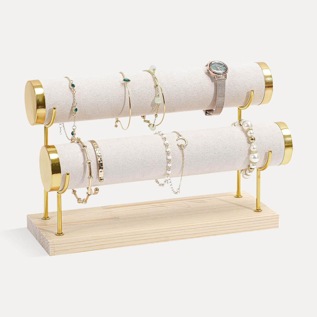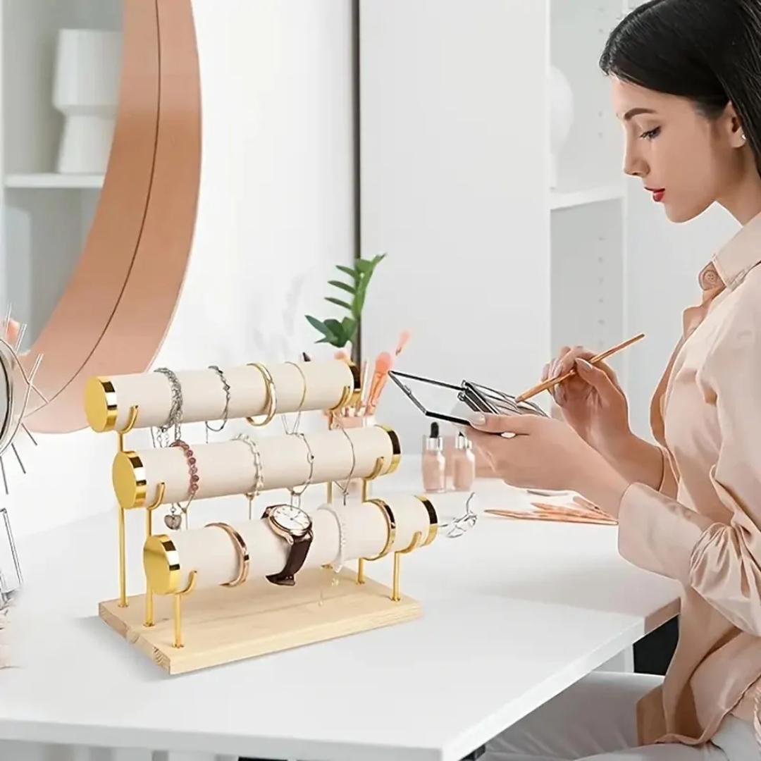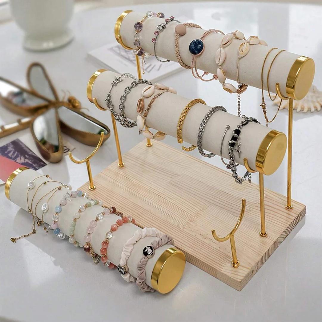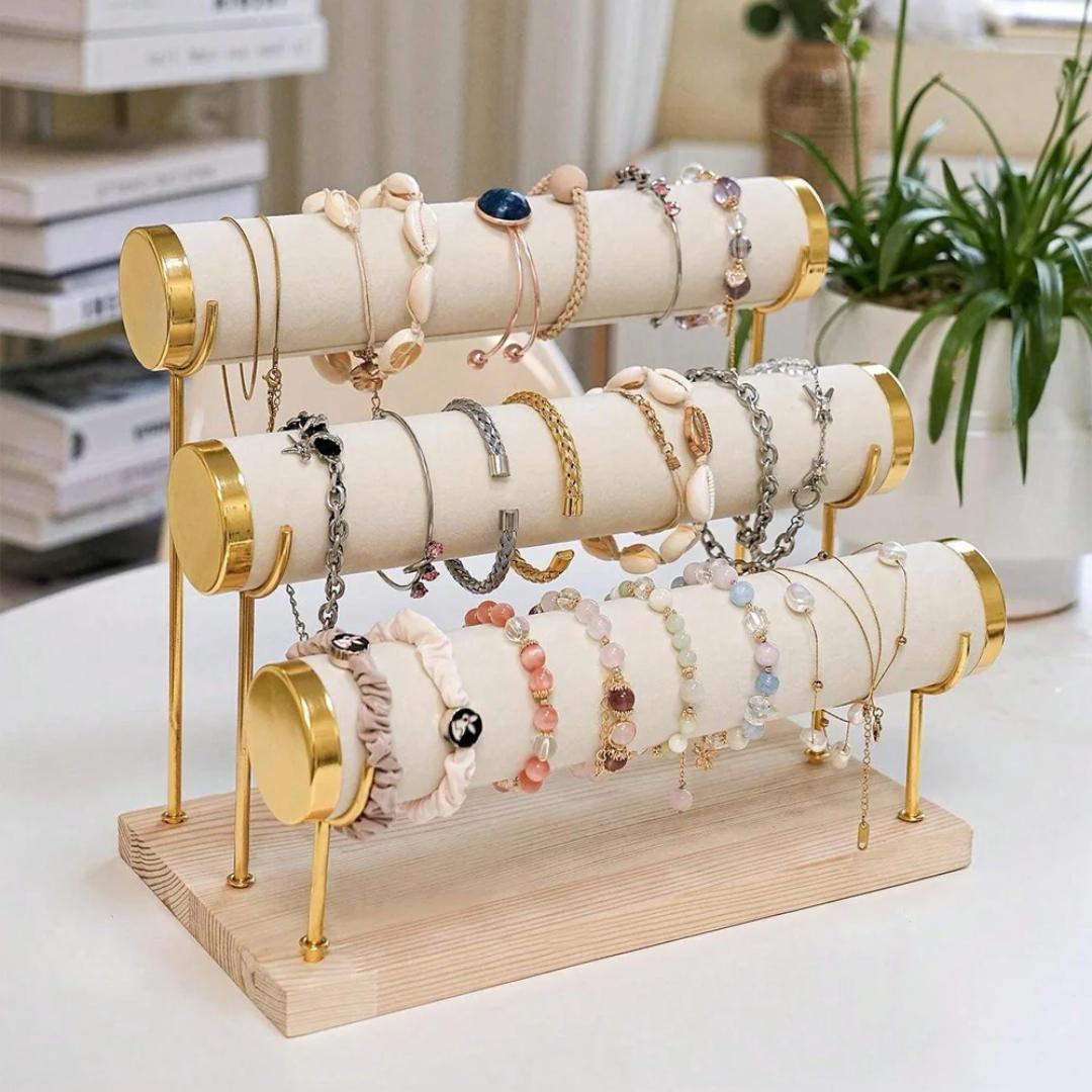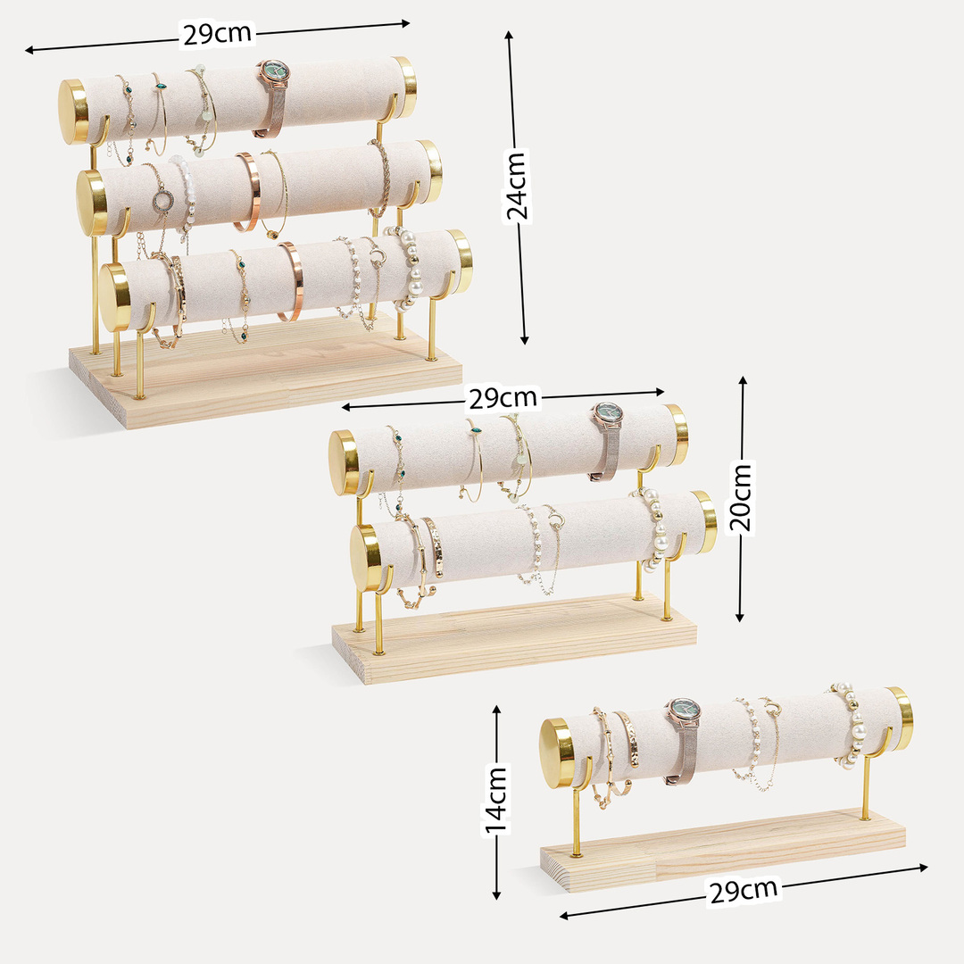 High-Capacity Display: Designed with 1,2&3 tier cylindrical bars, this jewelry stand offers ample space to neatly organize bracelets, watches, bangles, and small accessories in one place.