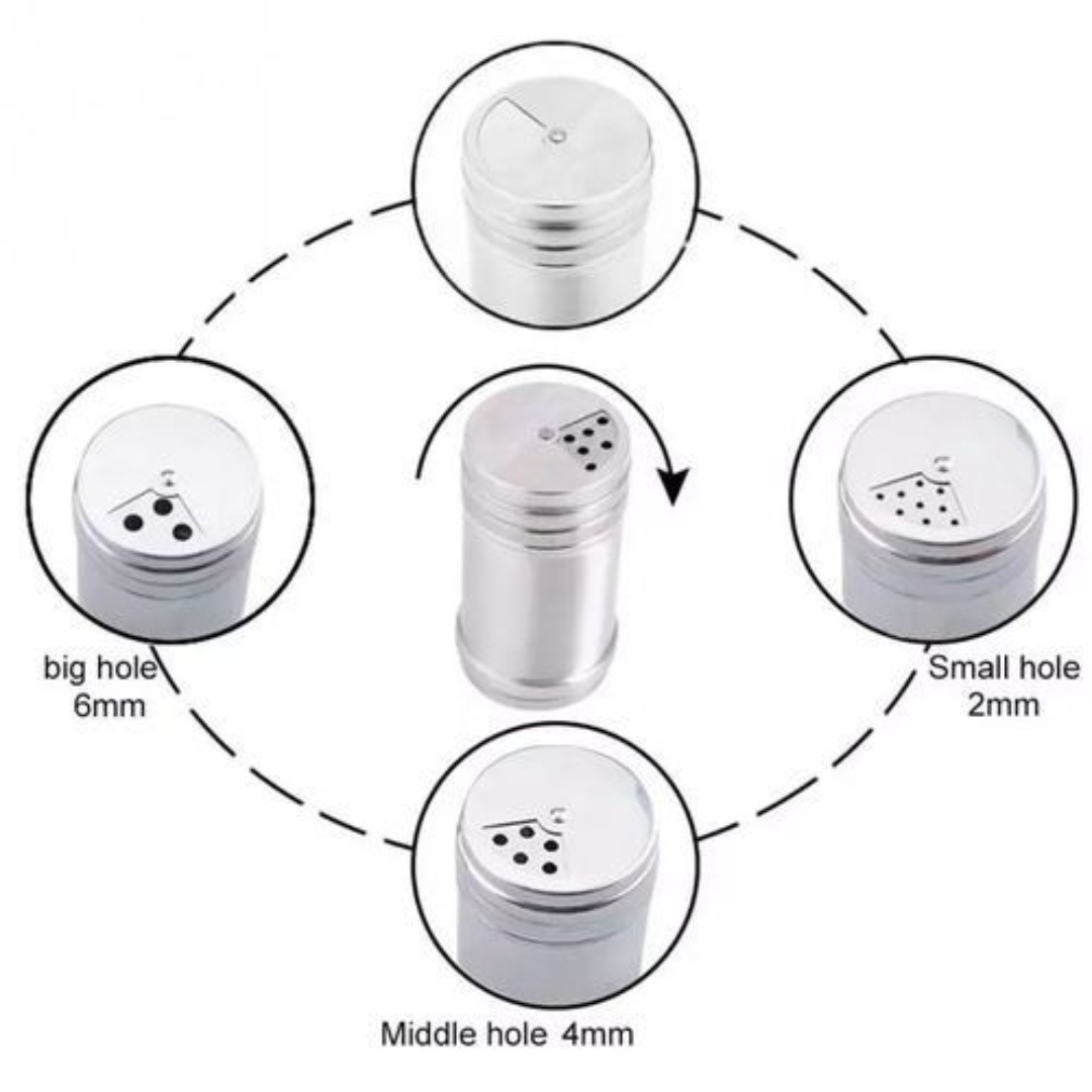 Adjustable Lid: Features a rotating dust-proof cover with three different hole sizes (2mm, 4mm, 6mm) to control seasoning flow as needed.