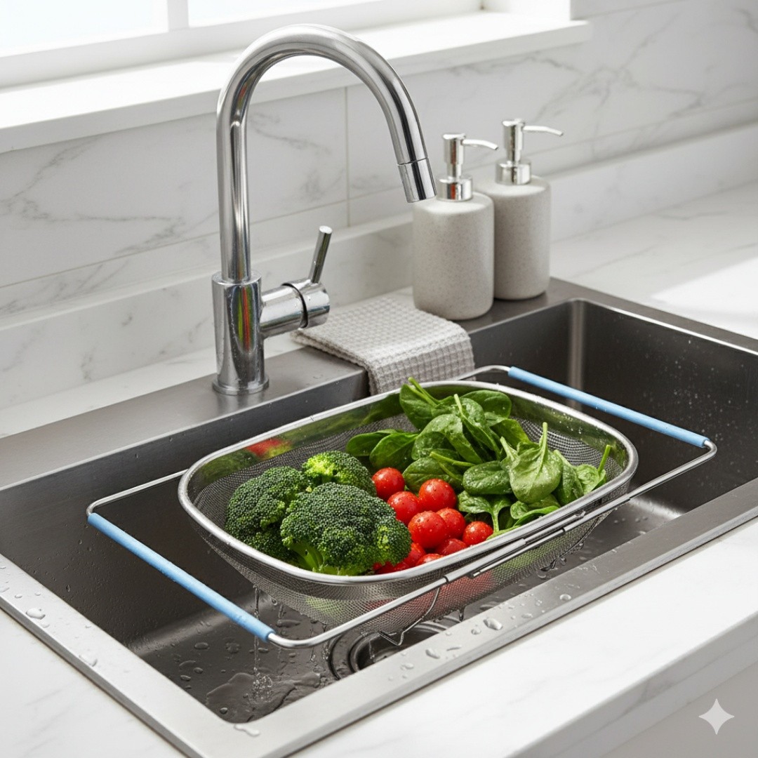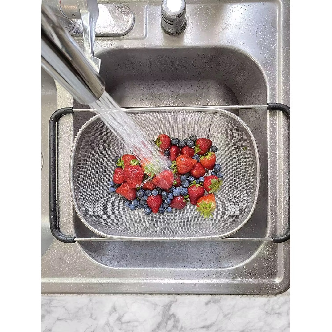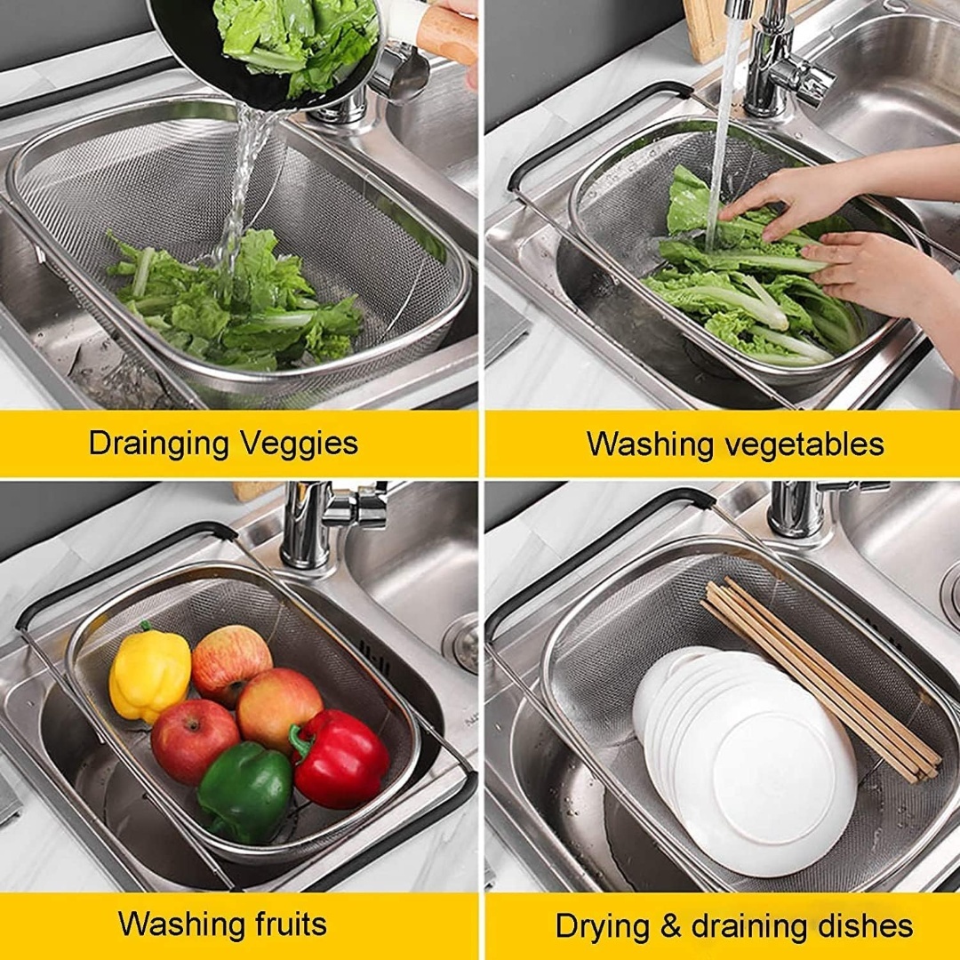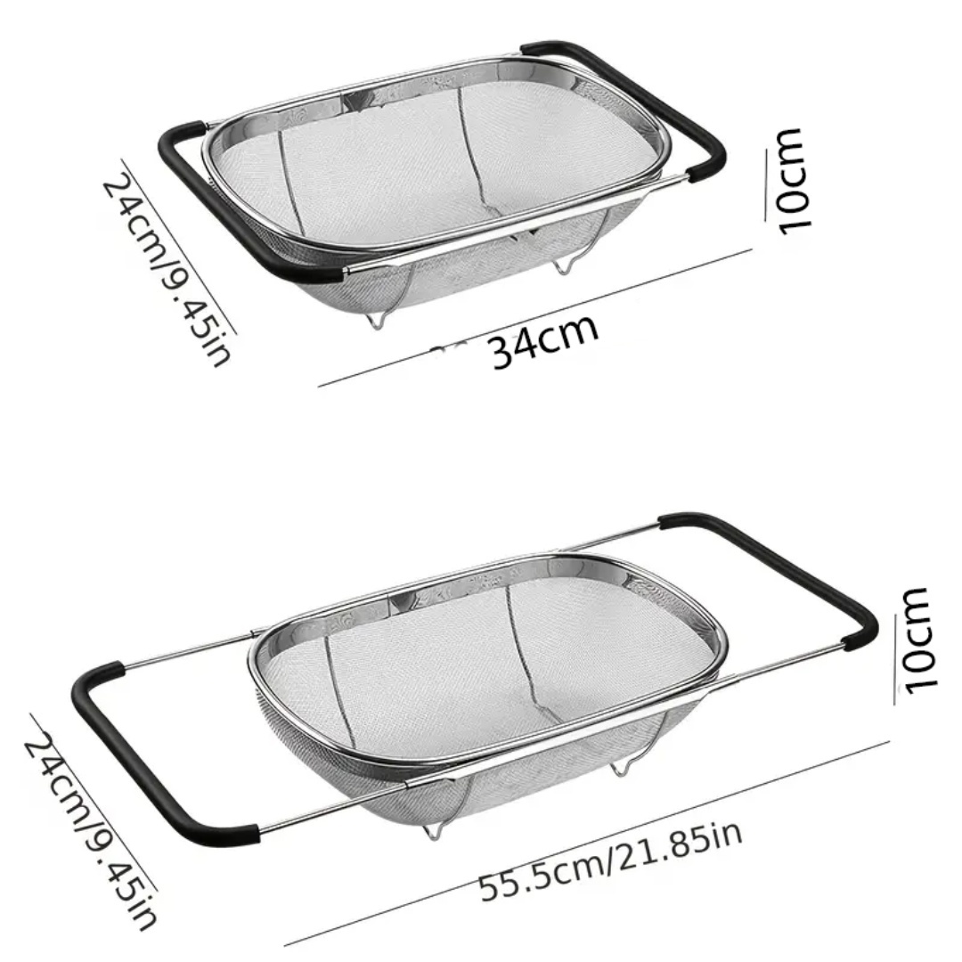 Expandable Design: Adjustable sink strainer stretches from 34x24cm, fitting most sink sizes with a sturdy mirror-finished rim and resting feet for stability.