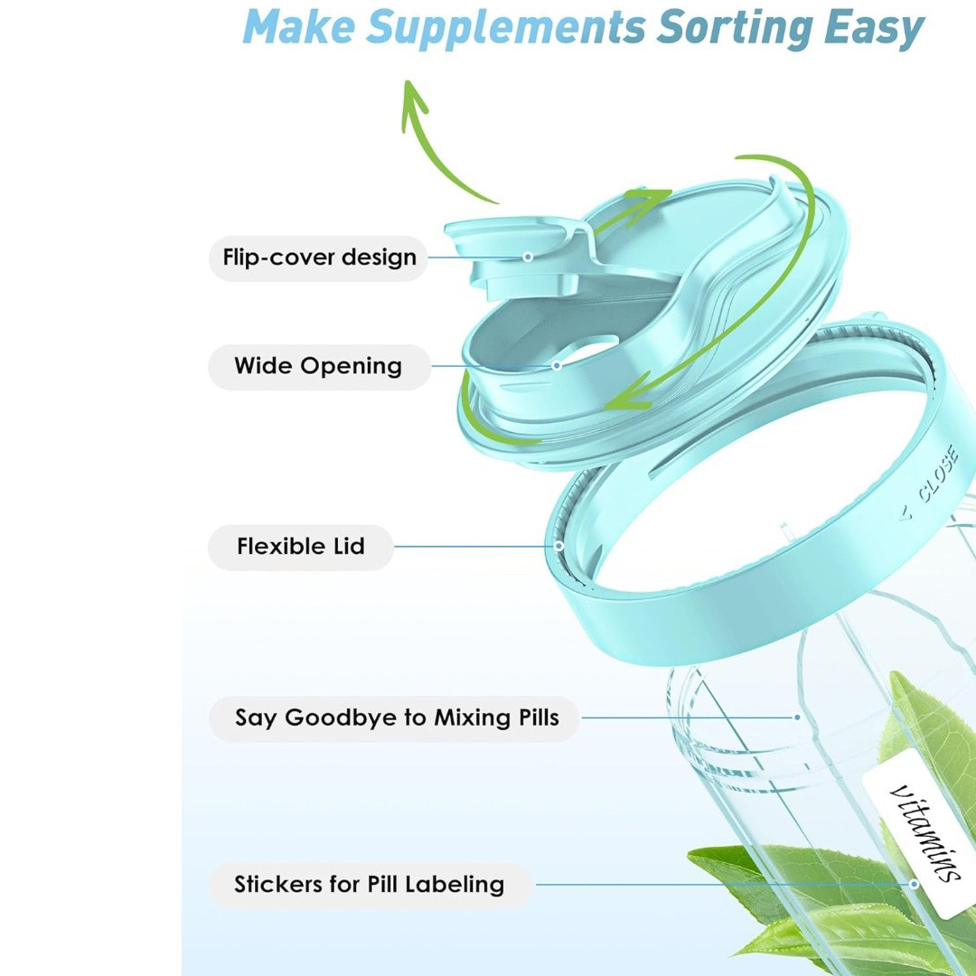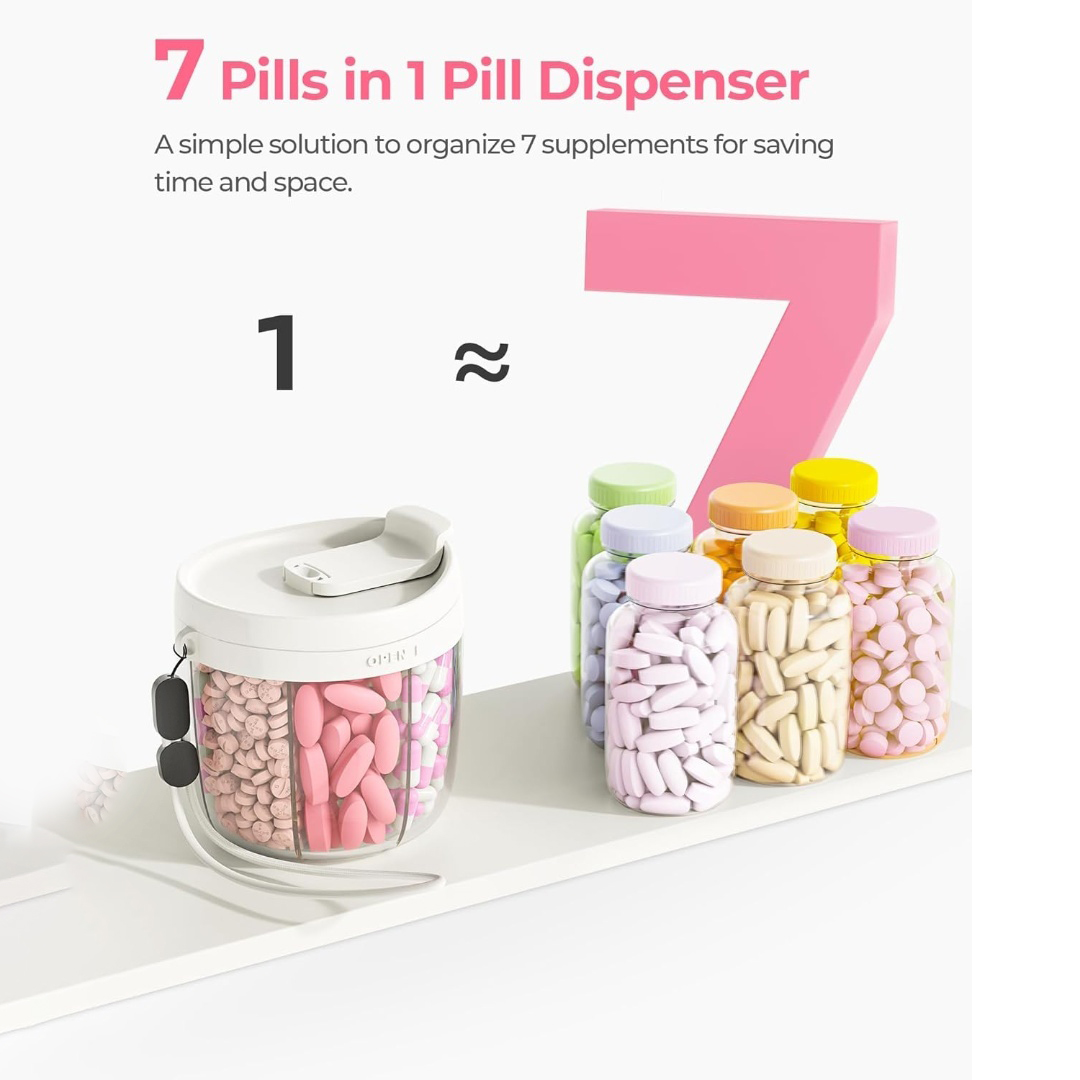 Compact All-in-One Storage: Combines 7 individual pill bottles into one organizer, each slot holding up to 40 capsules or 25 fish oil tablets for convenient supplement management.
