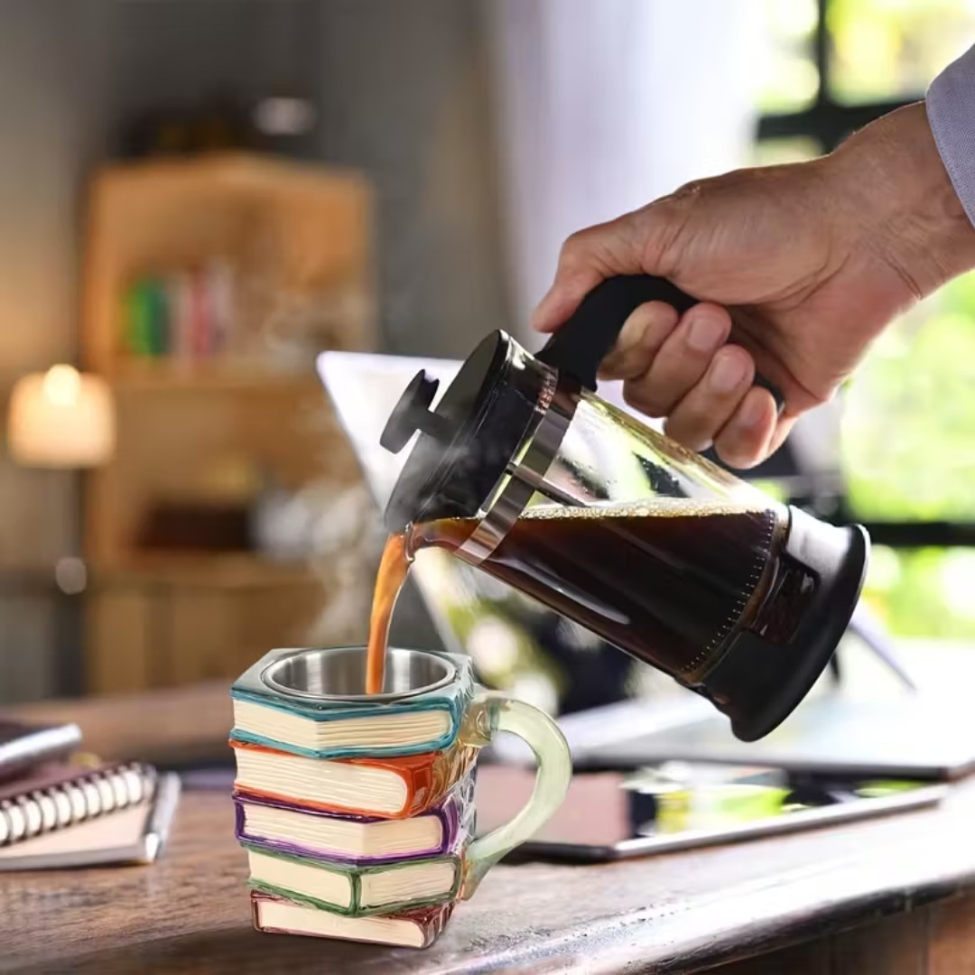 Painted Book Stack Design: Features a charming mug shaped like a stack of vintage novels, adding artistic character to any coffee moment.
