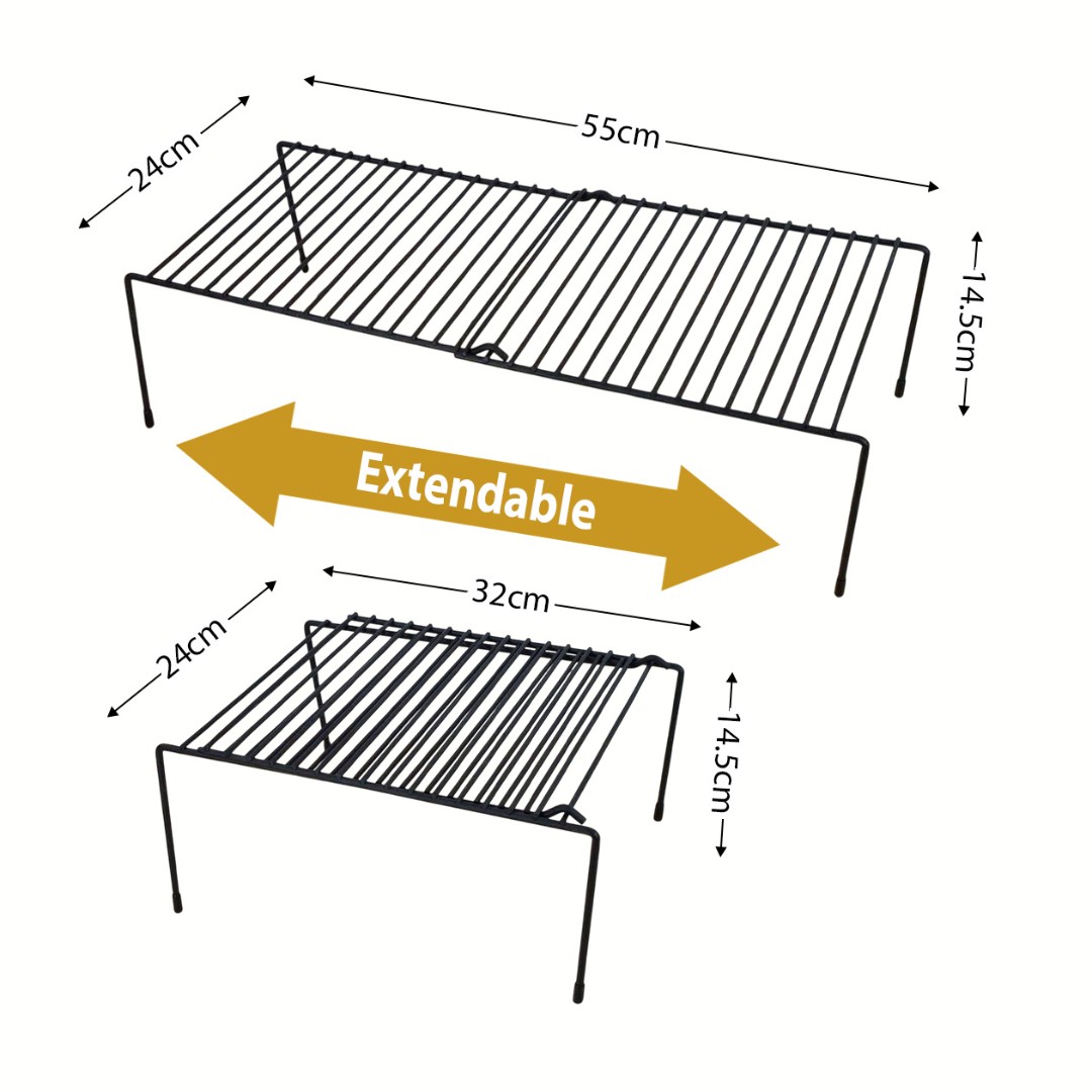 Expandable Adjustable Design: Features a smart extendable structure that adjusts in length from approximately 32 cm to 55 cm, allowing flexible fitting inside cabinets, shelves, or refrigerators.