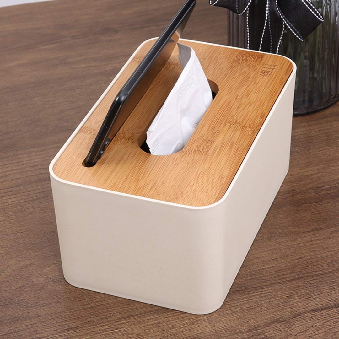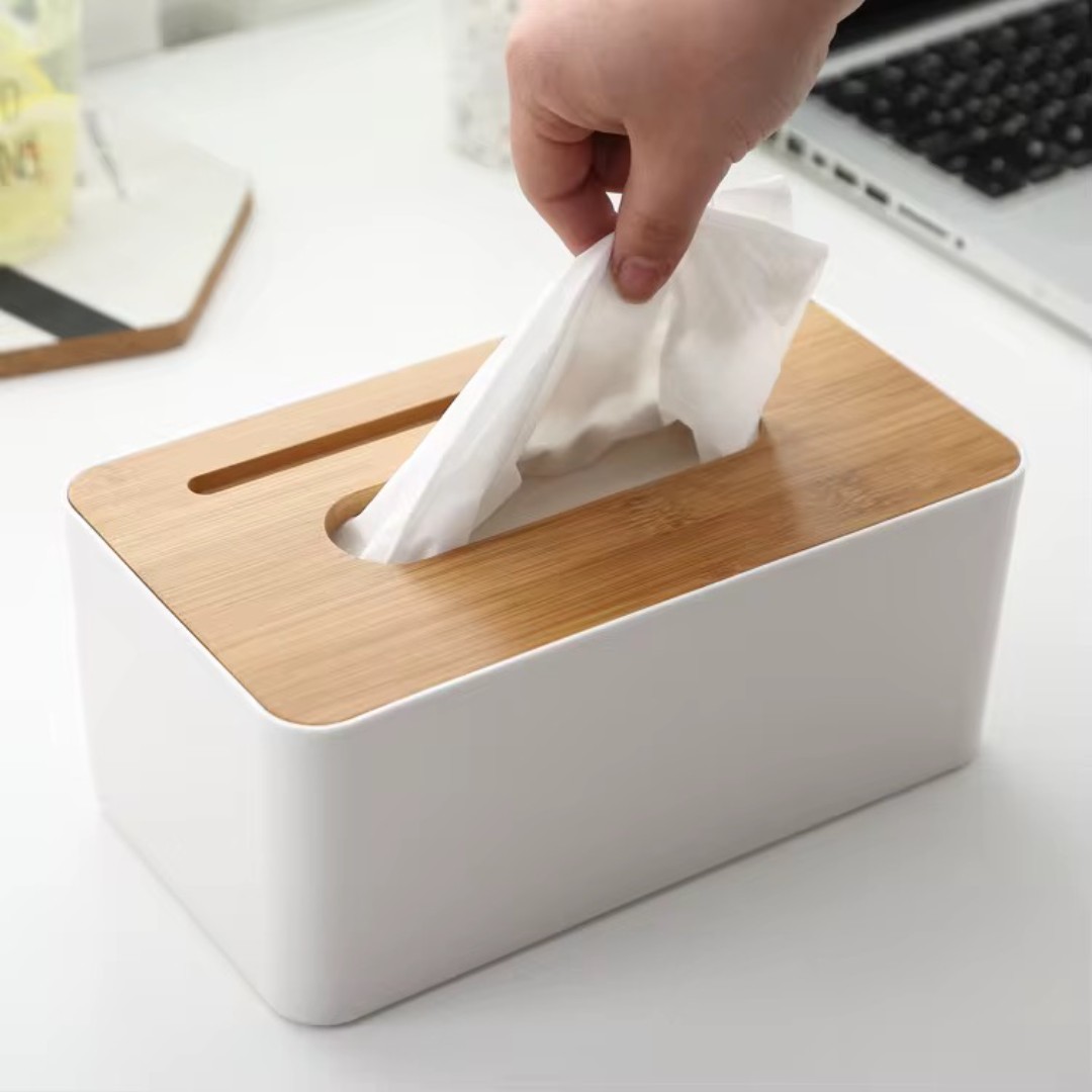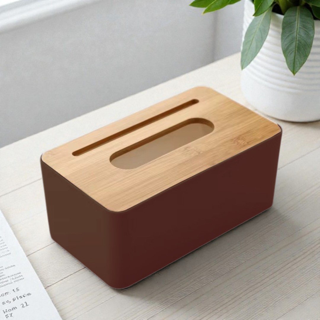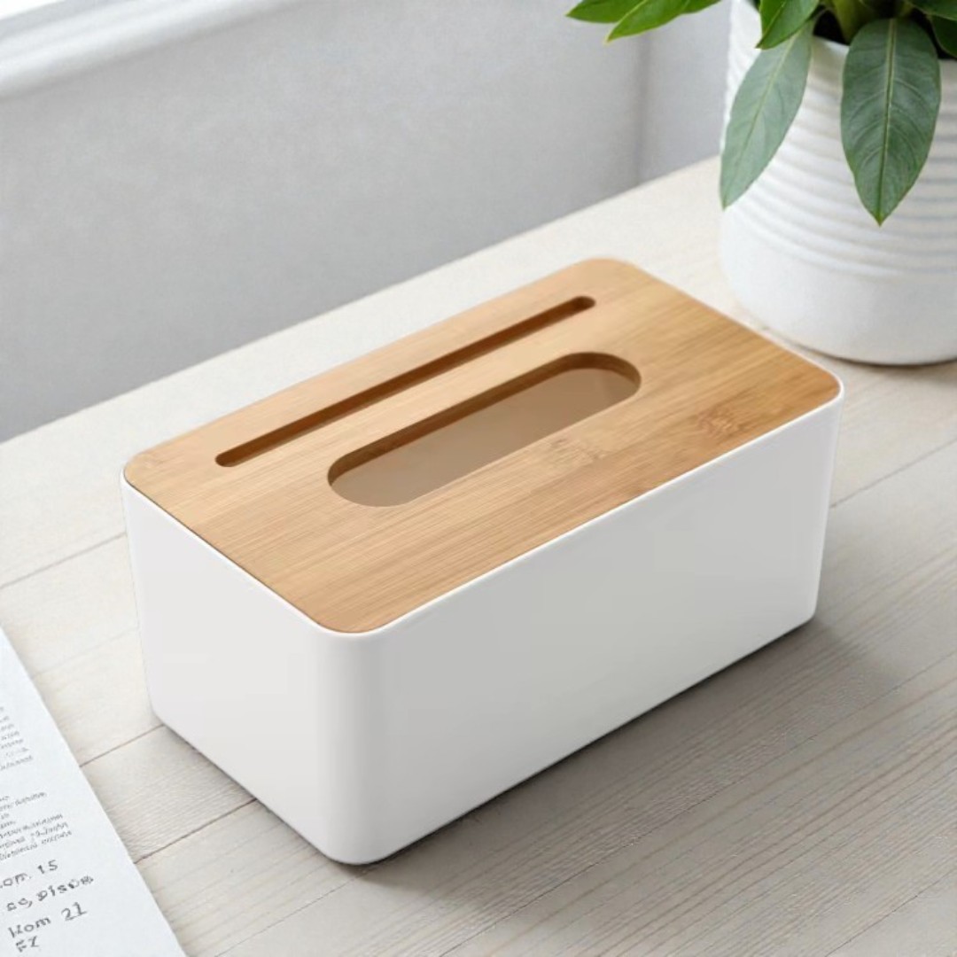 Modern Dual-Material Design: Elegant combination of a smooth plastic body with a natural bamboo lid, creating a stylish tissue box that enhances home, office, or bedside décor.