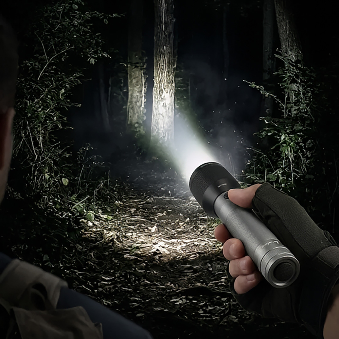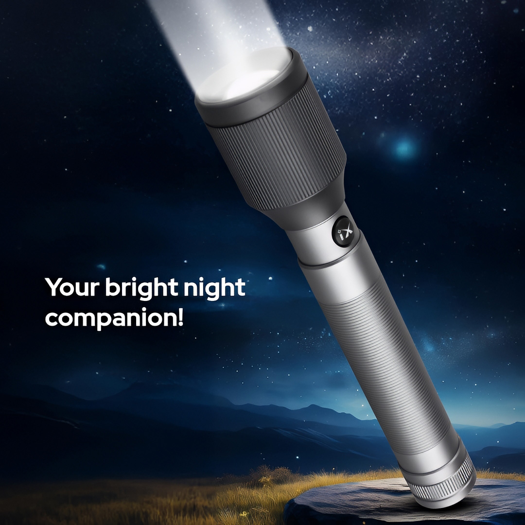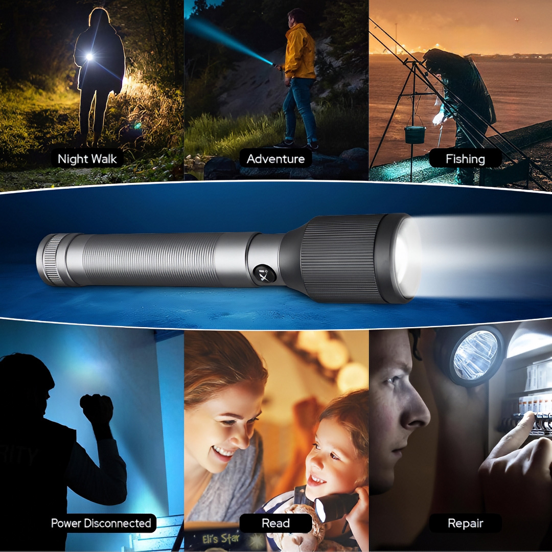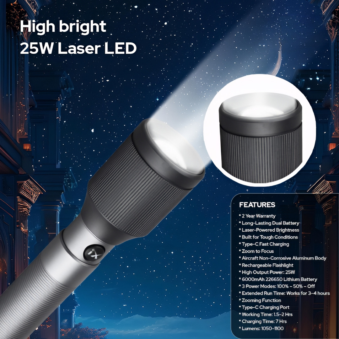 Ultra-Bright Laser LED Flashlight: Equipped with a powerful 25W laser LED that delivers intense illumination with an output of approximately 1050–1100 lumens, making it ideal for outdoor use, camping, security, and emergencies.