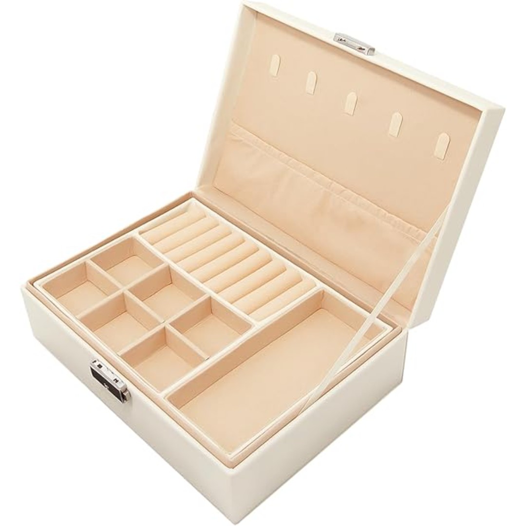 Smart Storage Layout: Features multiple compartments, ring slots, necklace hooks, and sections to neatly organize rings, earrings, bracelets, and necklaces.