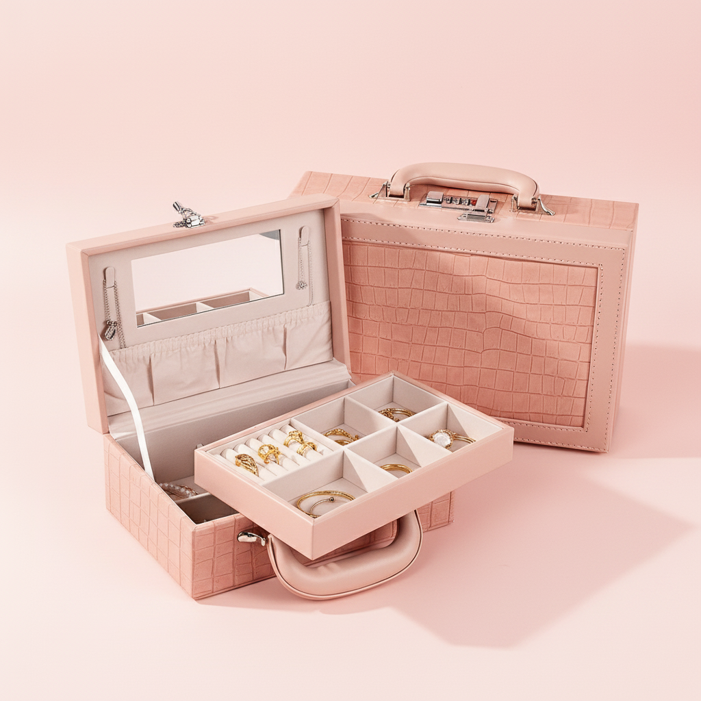 BUILT-IN MIRROR & STORAGE LID: Features an integrated mirror and upper lid pockets with hooks, perfect for organizing necklaces and keeping them tangle-free.