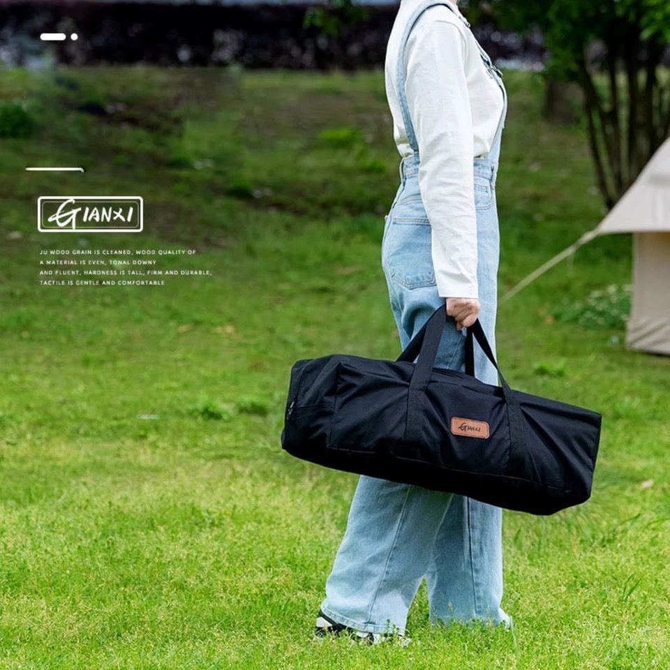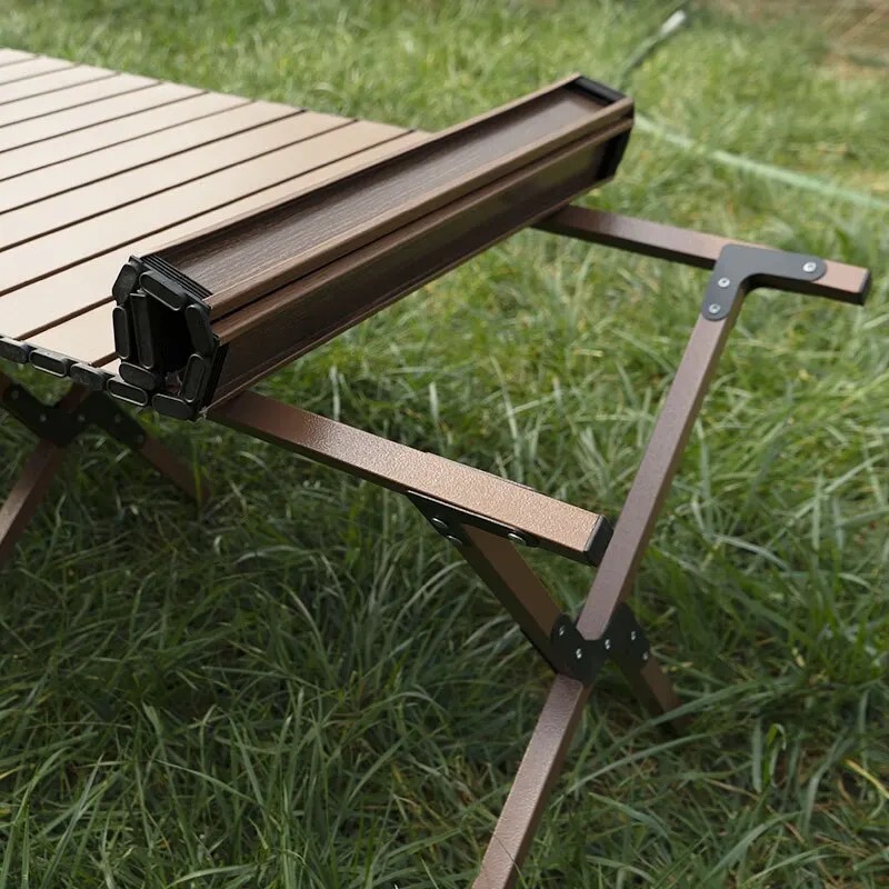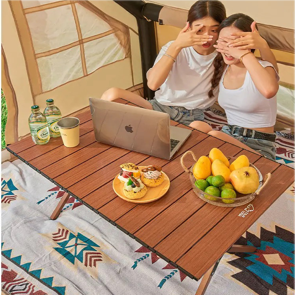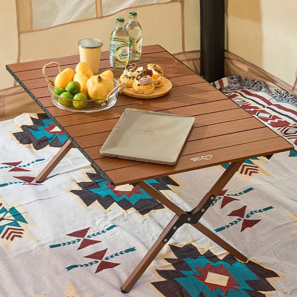 طاولة نزهة قابلة للطي، قمة طاولة من الألمنيوم المتداول، مع إطار صلب بتصميم X قابل للطي، وحقيبة يد.