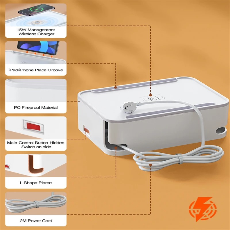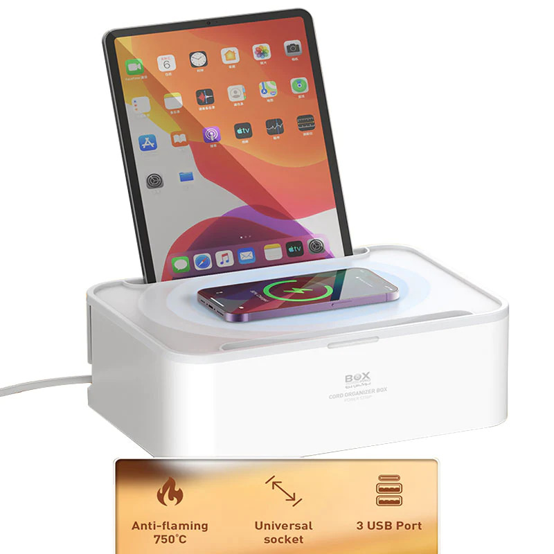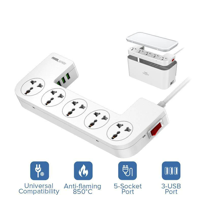 صندوق تنظيم الكابلات وشريط التوصيل مع 5 مأخذ + 3 منافذ USB ومحول طاقة. اللون: أبيض. ملحق للتوافق العالمي مع مصدر طاقة عالمي.