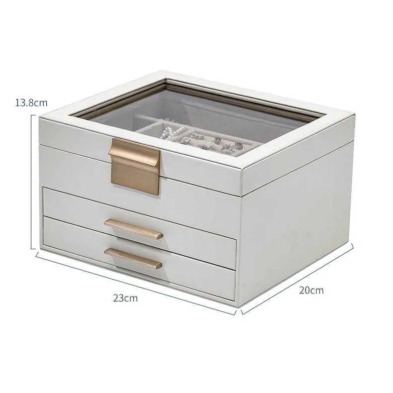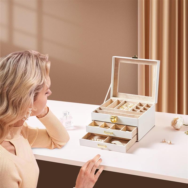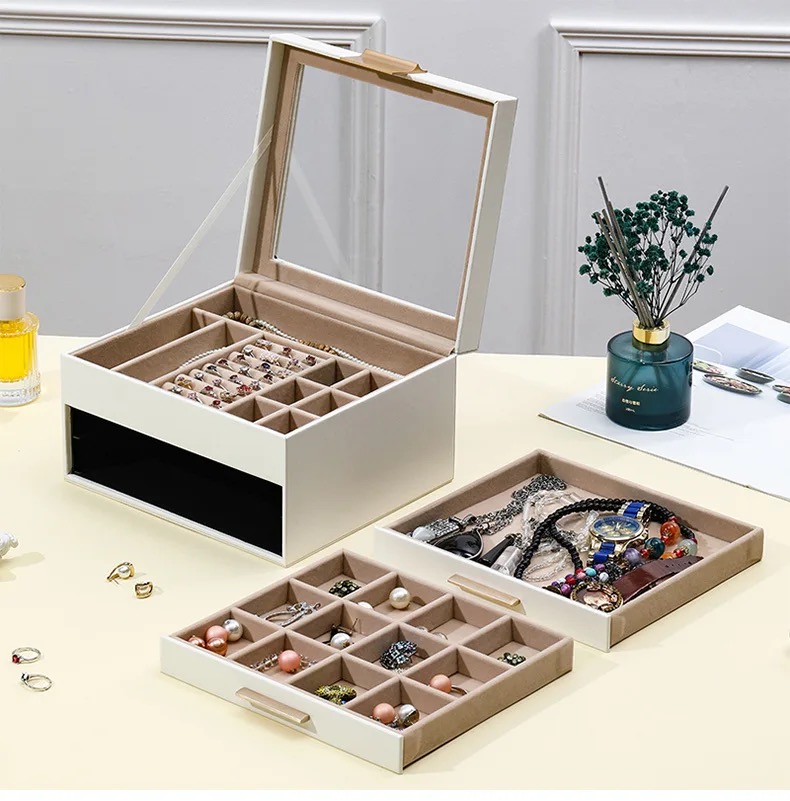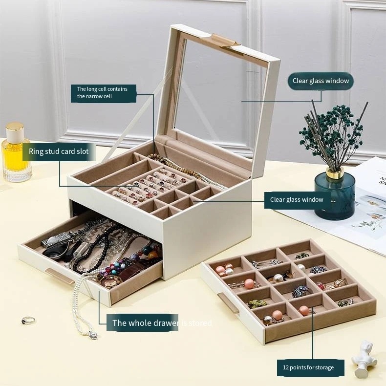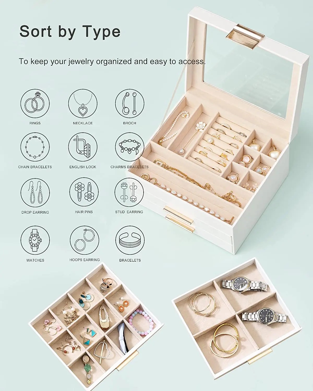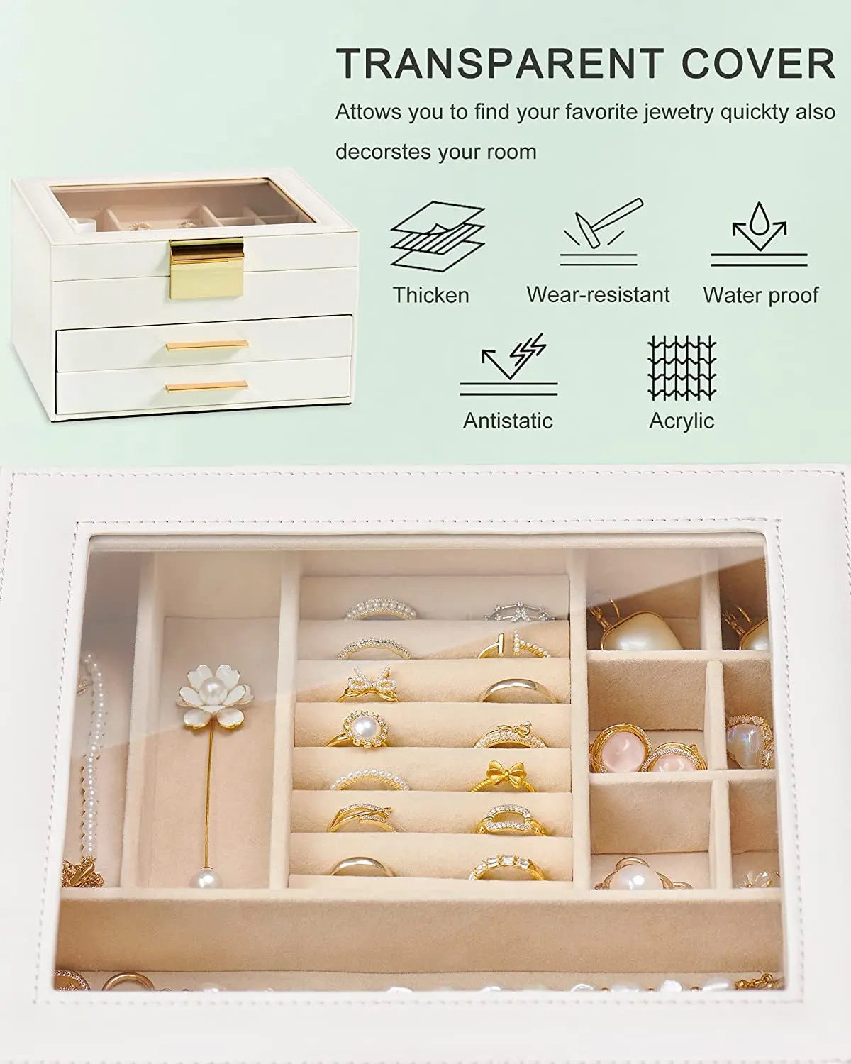 نافذة شفافة: تم تصميم صندوق المجوهرات هذا بنافذة شفافة في الأعلى. فهو لا يحمي مجوهراتك الثمينة من الغبار فحسب، بل يعرضها أيضًا بشكل جميل، مما يجعل من السهل عليك اختيار القطعة المفضلة لديك في لمحة.