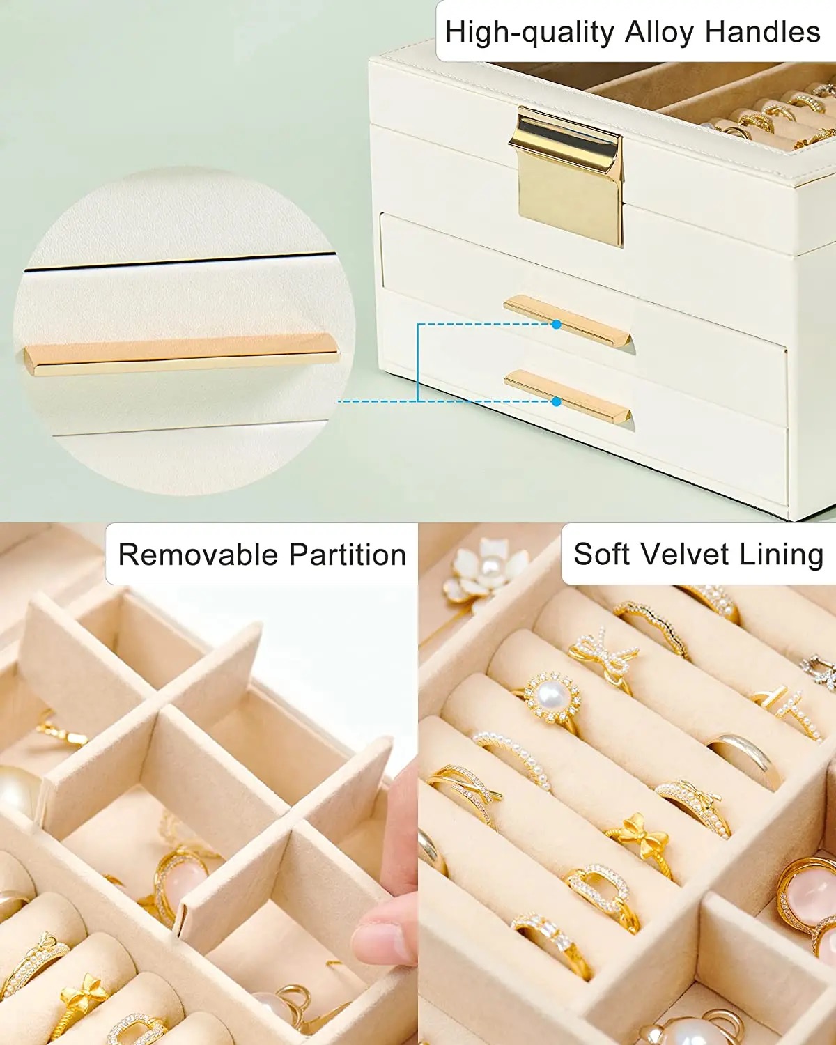 مساحة تخزين واسعة: قل وداعًا للفوضى والمجوهرات المؤكسدة مع صندوق المجوهرات المكون من ثلاث طبقات. مزود بدرجين يتميزان بمقصورات وتخطيطات مختلفة قابلة للإزالة، هذا الصندوق يحافظ على جميع مجوهراتك مرتبة ومنظمة دون عناء.