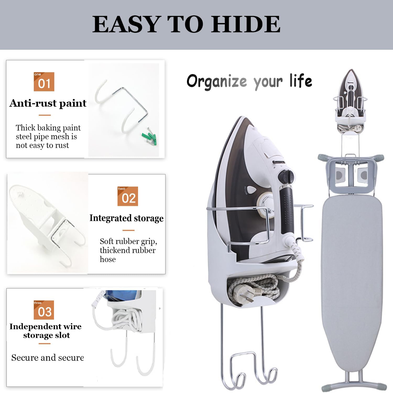 موفر للمساحة ومنظم: يتيح لك تصميمه الأنيق استغلال المساحة الجدارية بشكل كامل ويحافظ على ترتيب منطقة الغسيل، ويحتوي على فتحة تخزين سلكية مدمجة وخطافات للطاولات الكي على شكل T أو V.