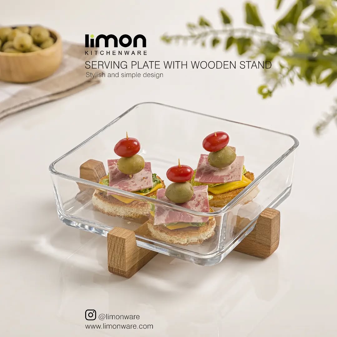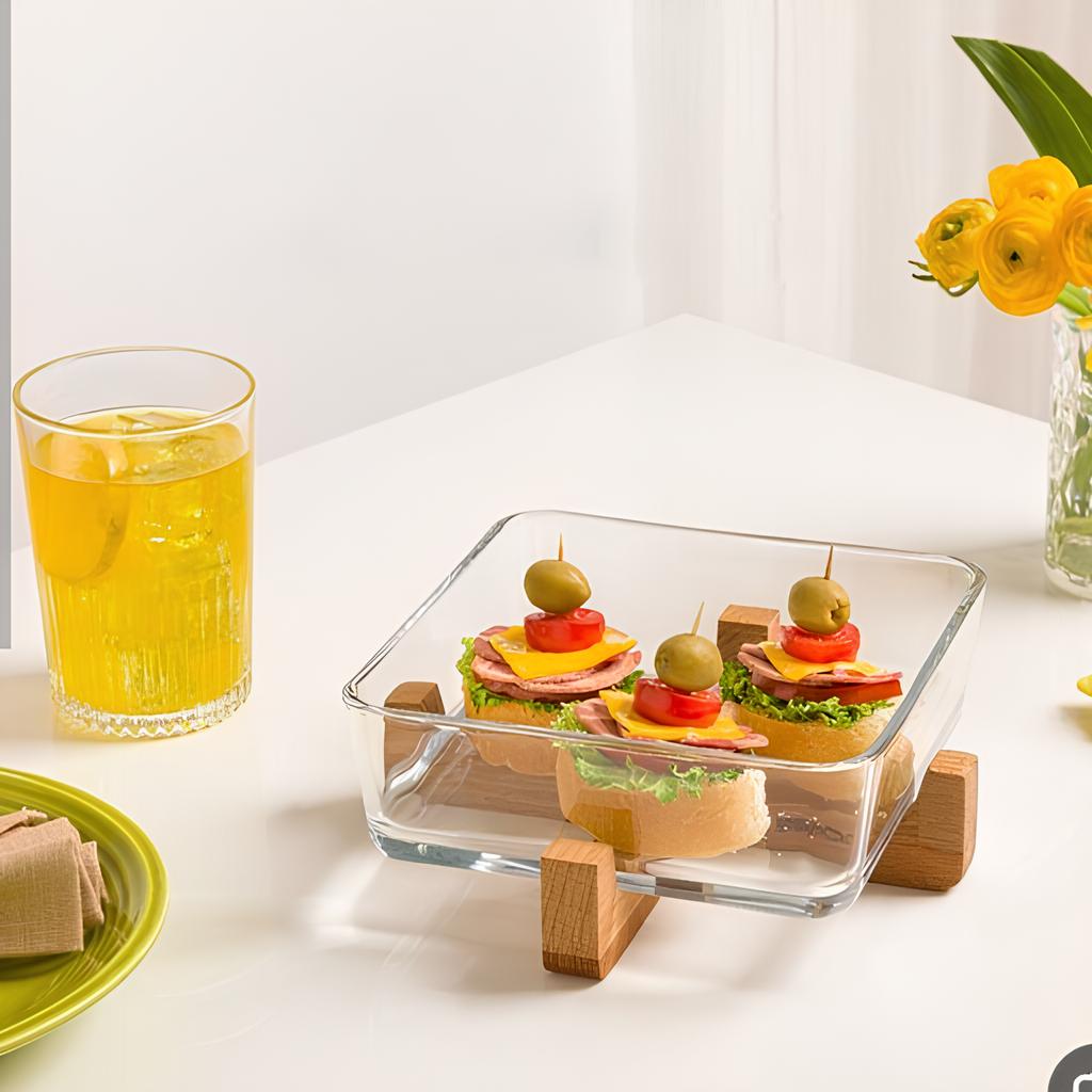 تصميم عصري وأنيق – يجمع بين شفافية الزجاج وجمال الخشب الدافئ، ليعطي لمسة راقية وعصرية لتقديم الطعام.
