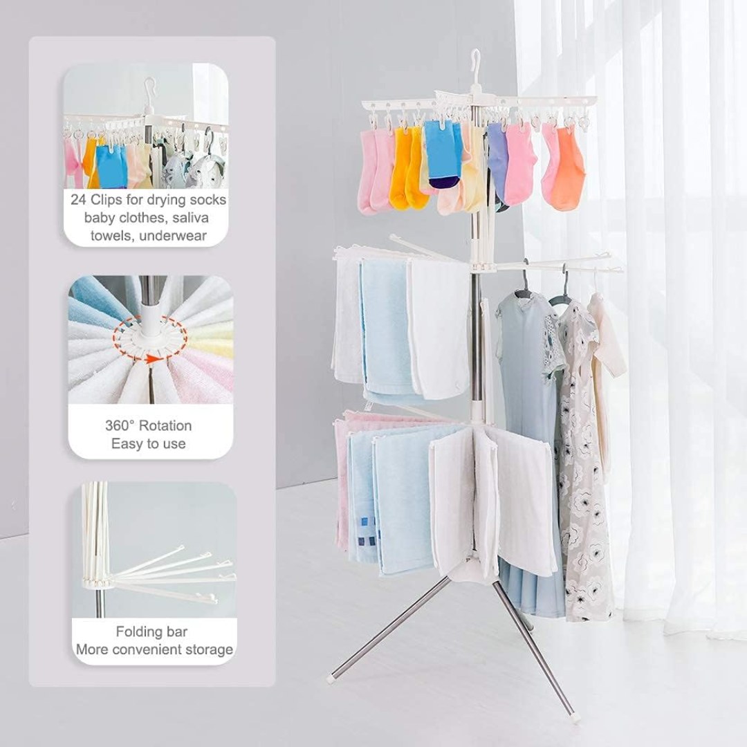 مثالي لتجفيف الملابس، الجوارب، المناشف، البطانيات وغيرها. يوفر التصميم ذو الطبقتين تعرّضاً متساوياً لأشعة الشمس وتجفيفاً أسرع لجميع أنواع الغسيل سواء في الداخل أو الخارج.