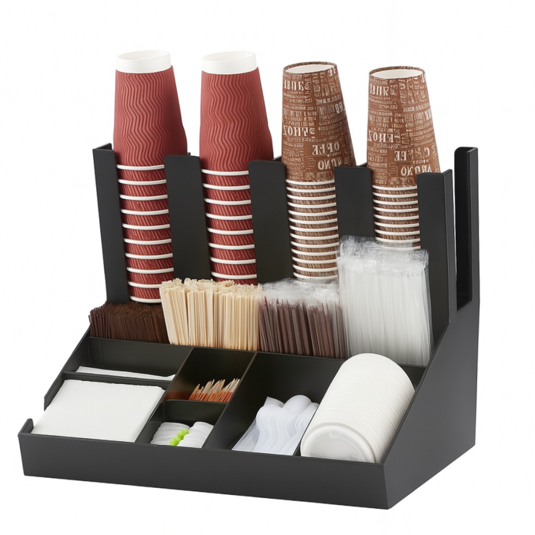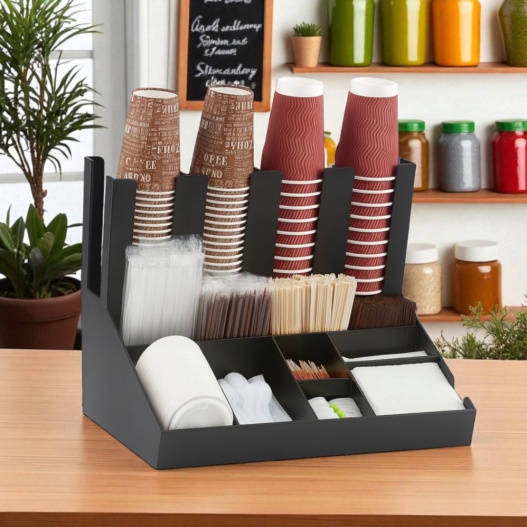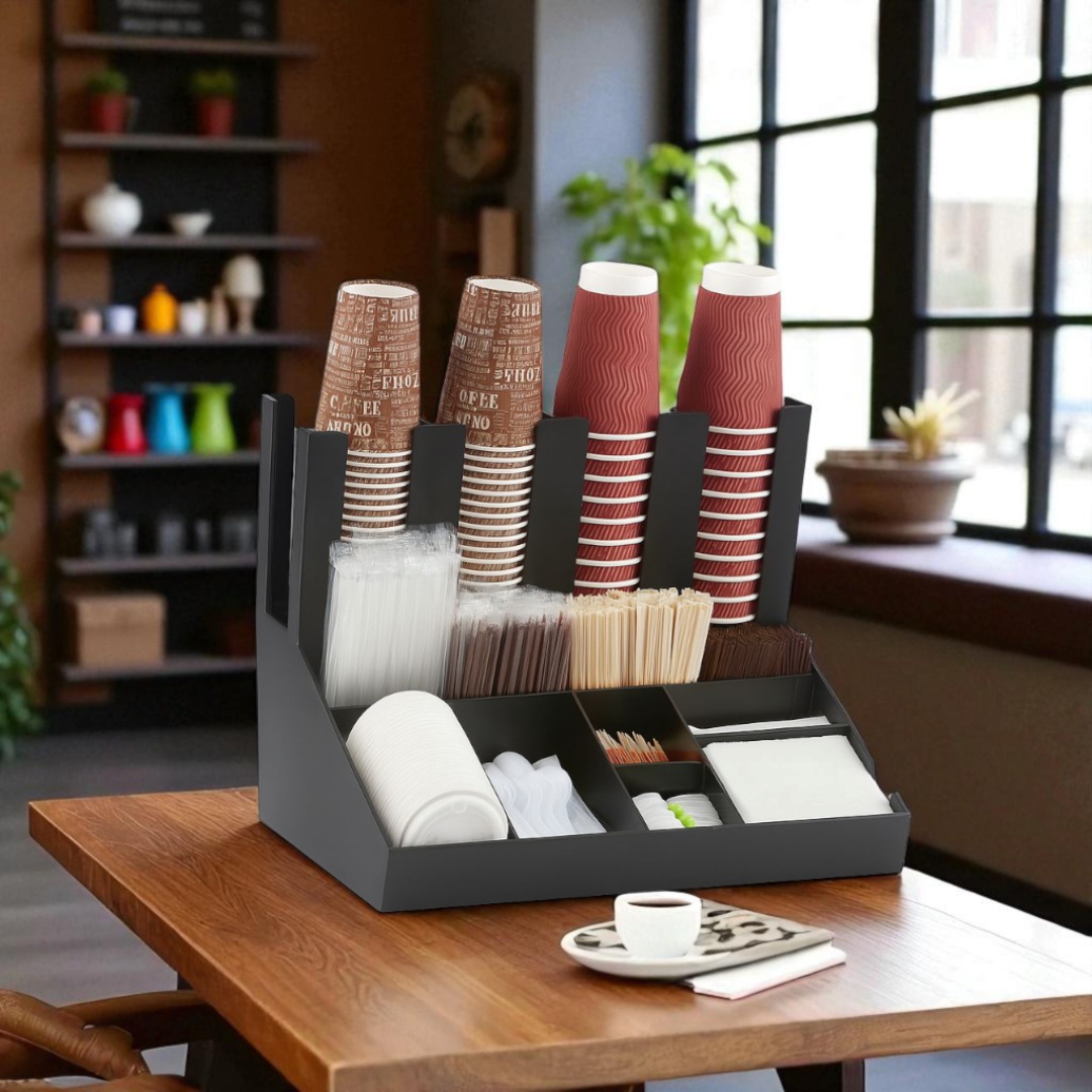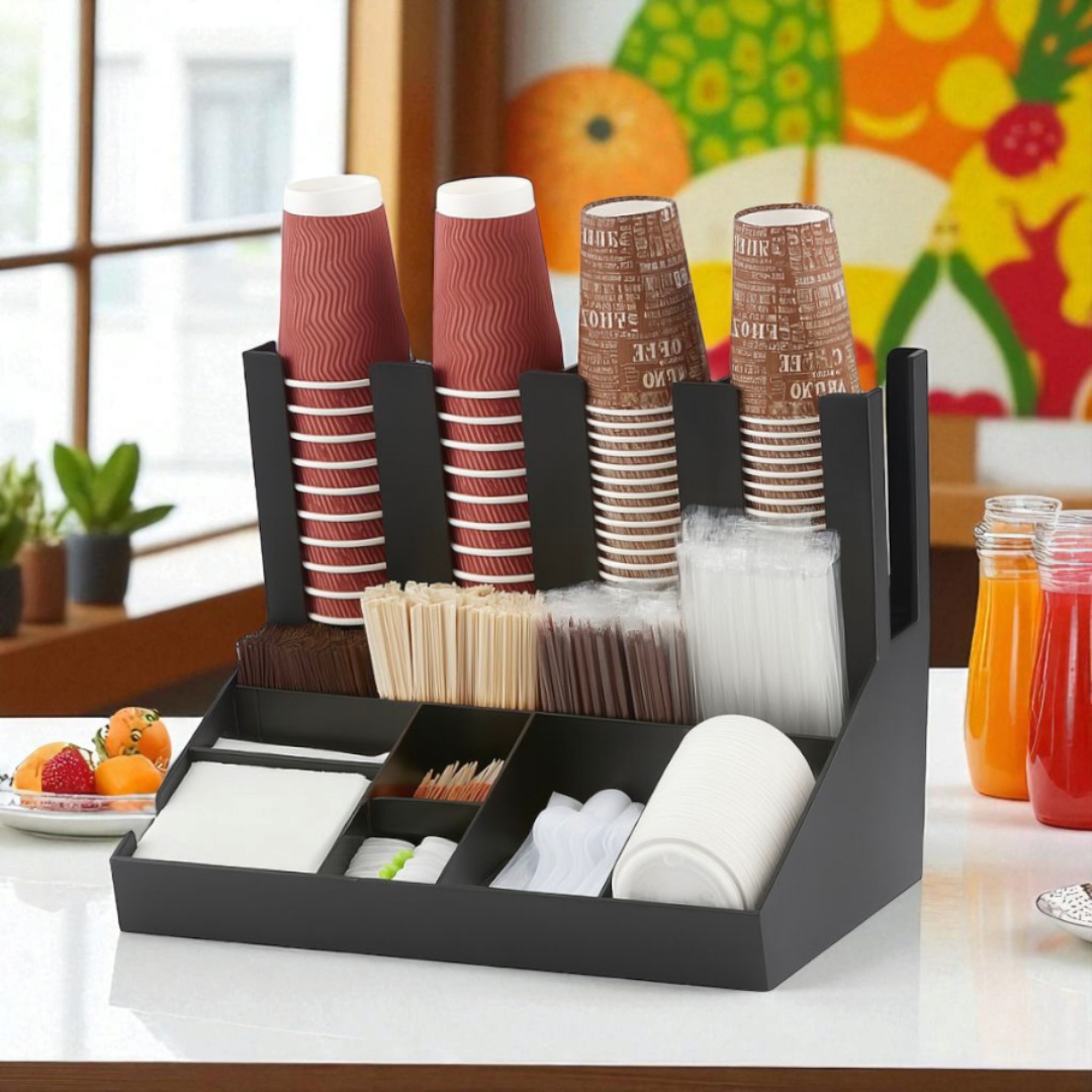 تخزين متعدد المستويات: يتميز هذا المنظم بتصميم متعدد المستويات مع أقسام محددة بوضوح لحمل الأكواب، الأغطية، المحركين، القش، المناديل، والتوابل—مما يحافظ على محطة القهوة منظمة وفعالة.
