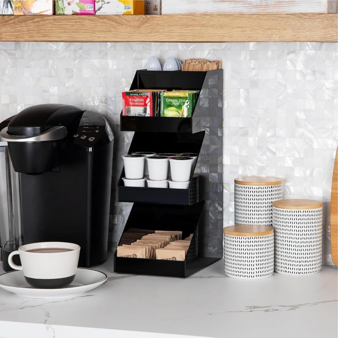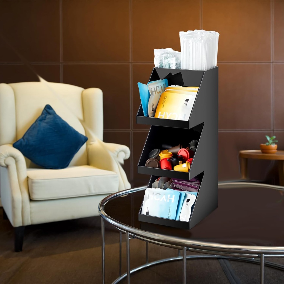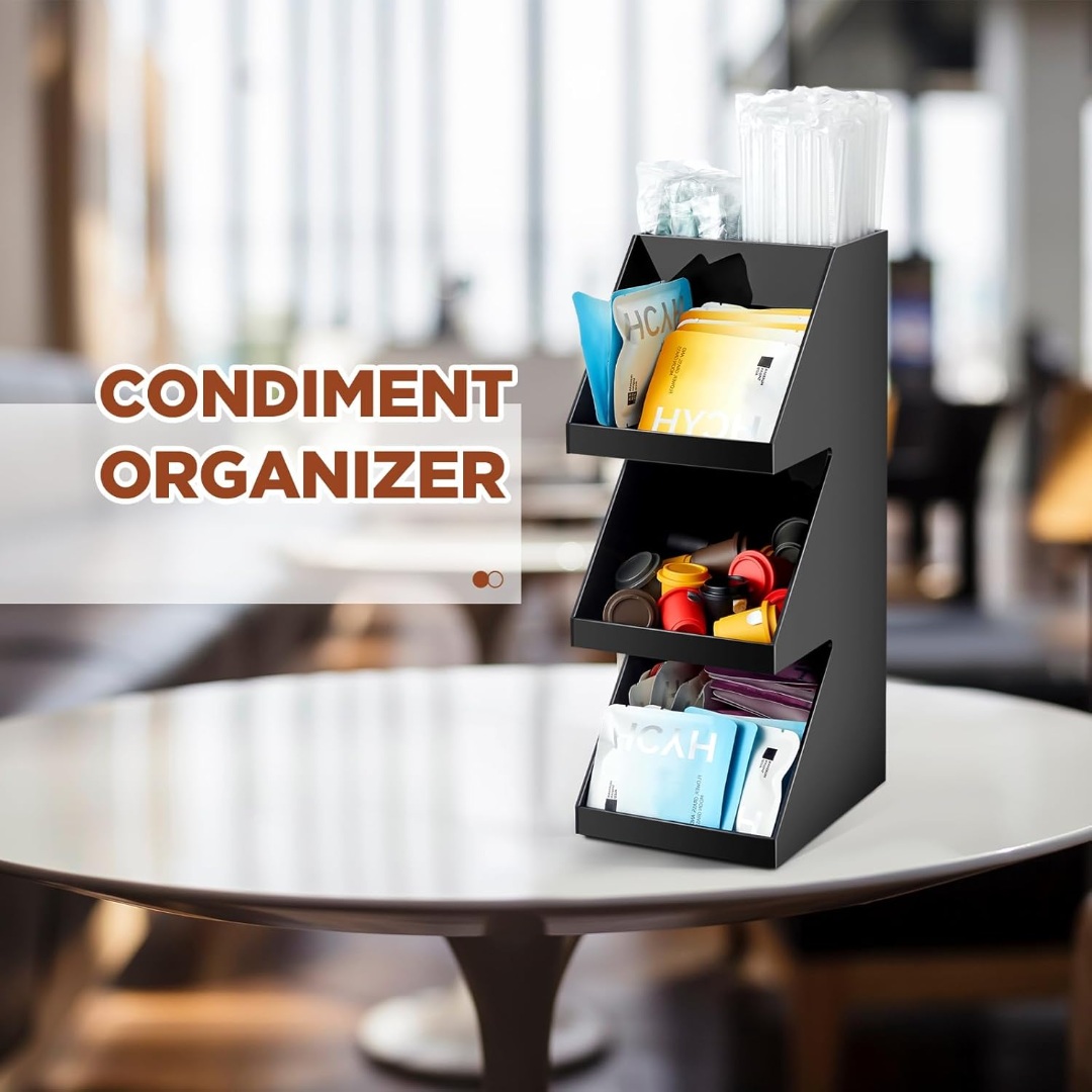 تصميم عمودي موفر للمساحة: يتميز هذا المنظم ذو الثلاث طبقات بخمسة أقسام مائلة لتخزين القش، السكر، أكياس الشاي، الكريمات، والمزيد بشكل مرتب مع الاستفادة القصوى من المساحة العمودية.