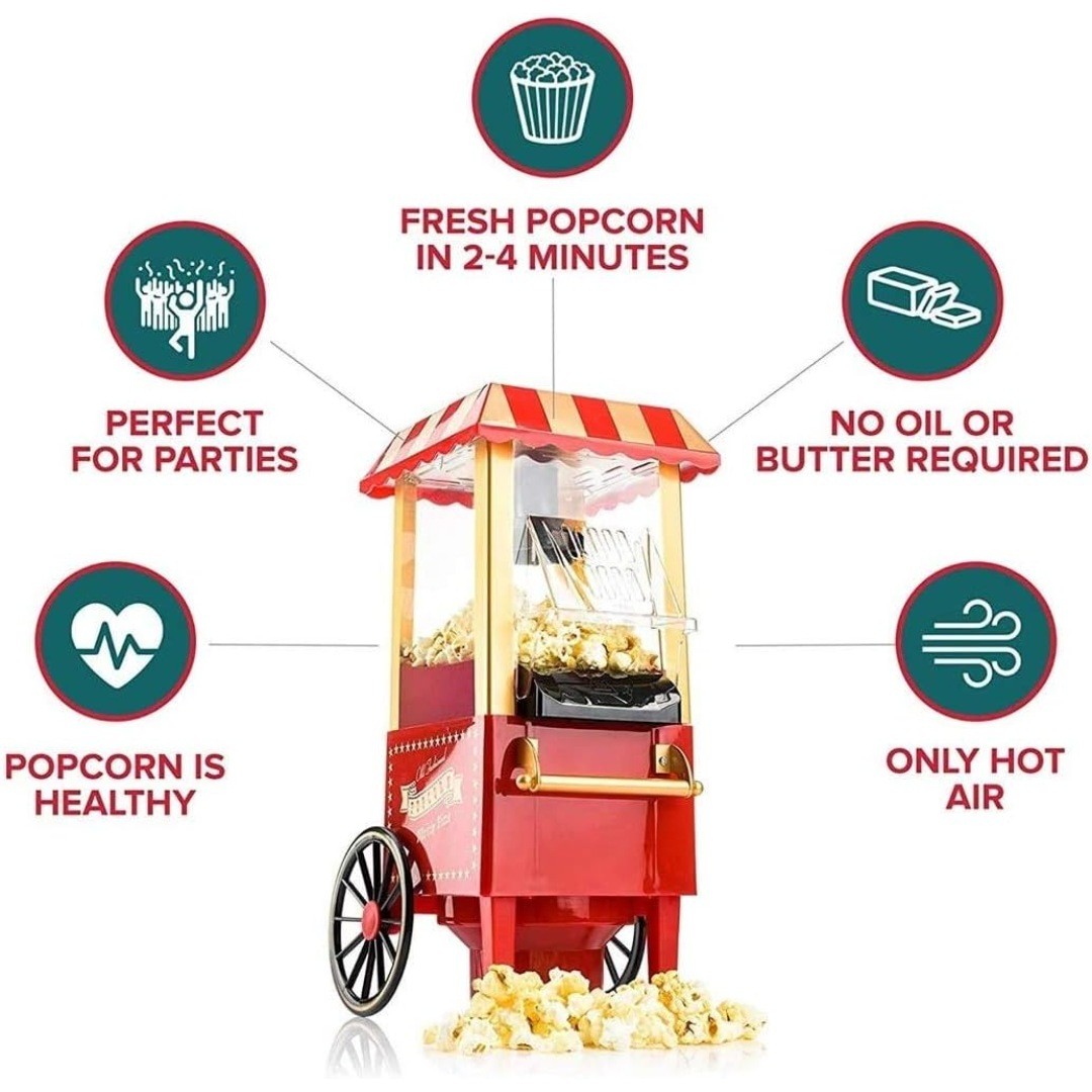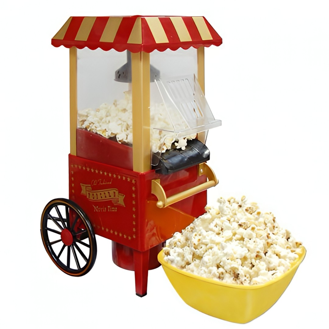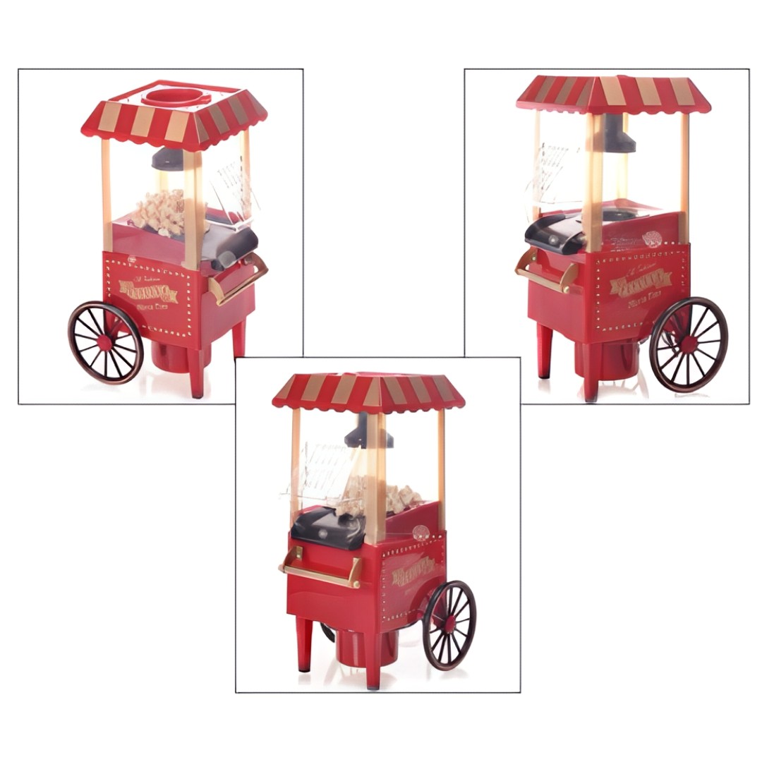 تصميم كلاسيكي عتيق – يتميز بمظهر عربة الفشار القديمة مع ألوان حمراء وذهبية أنيقة، مما يضيف لمسة من الحنين إلى الماضي لأمسيات الأفلام أو الحفلات.