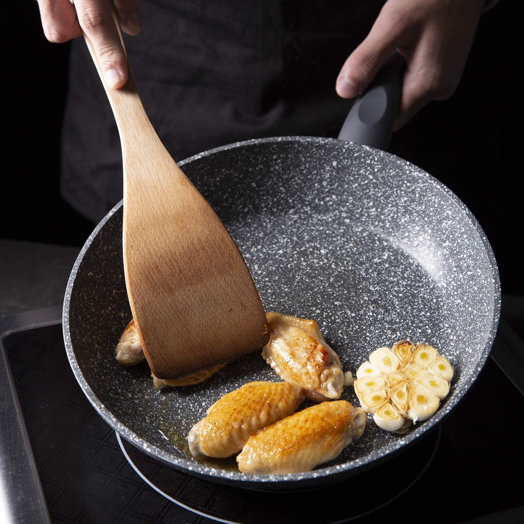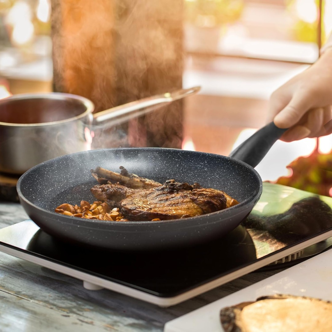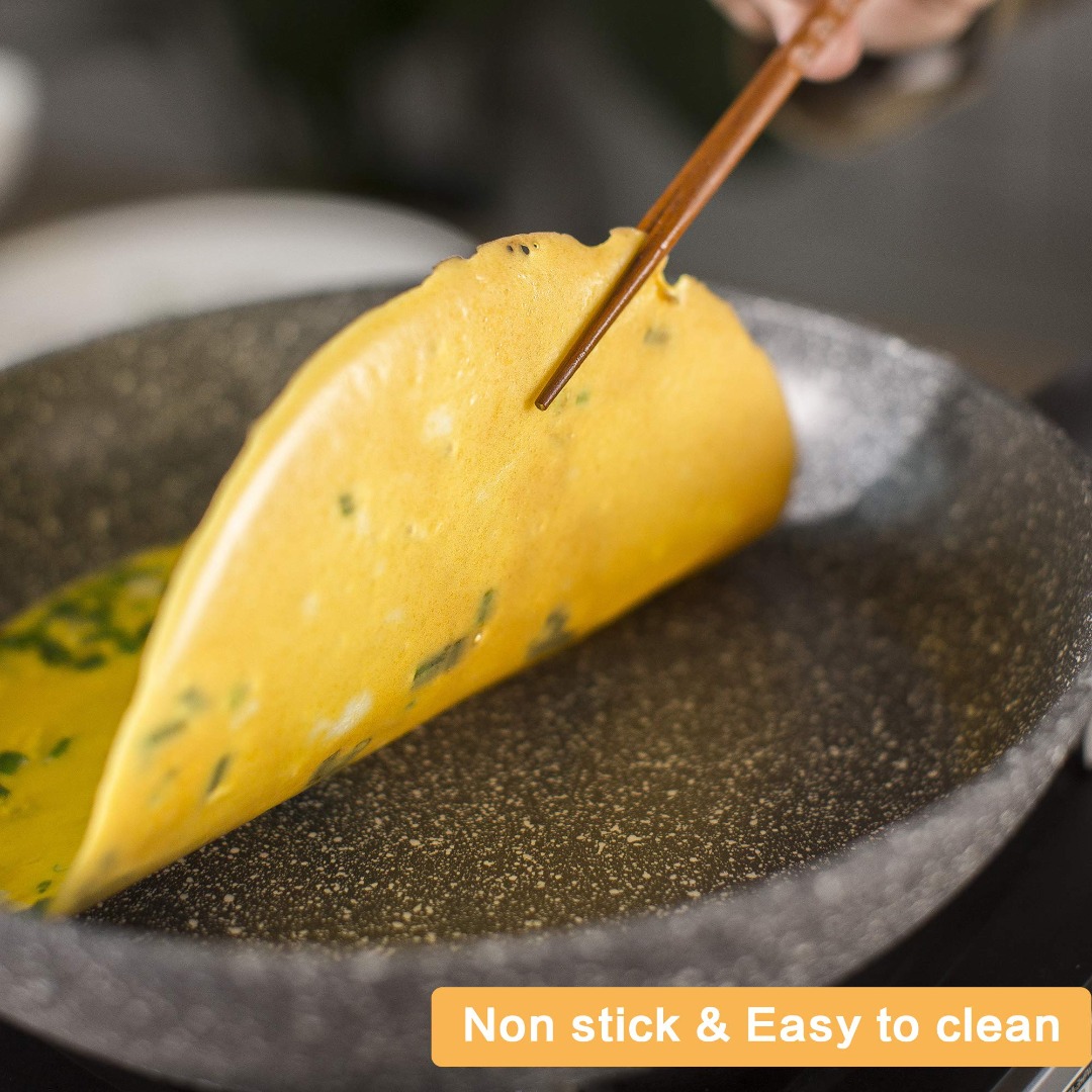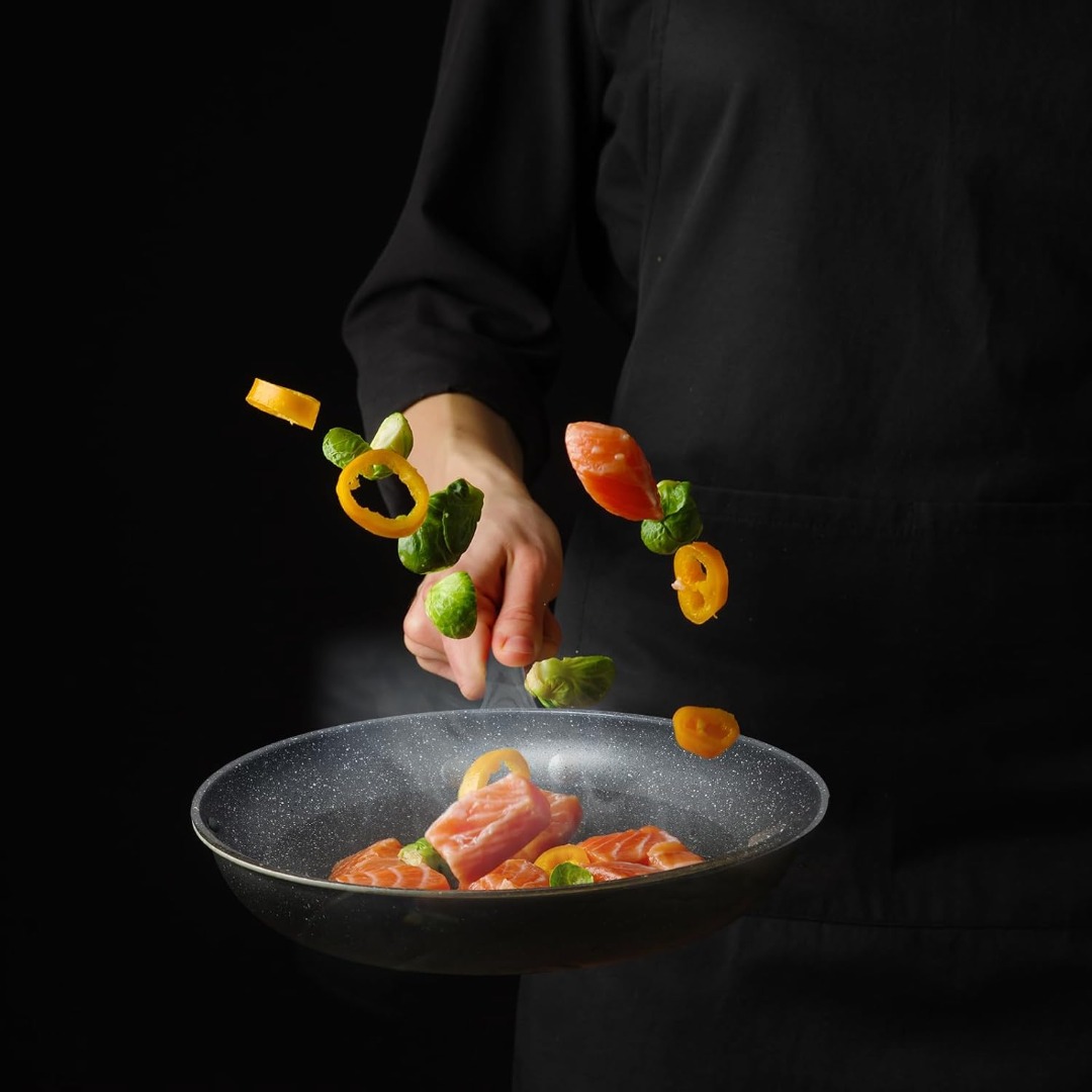 طلاء غير لاصق – يتميز السطح بثلاث طبقات من الطلاء غير اللاصق لتسهيل الطهي والتنظيف، مما يمنع التصاق الطعام ويحافظ على نكهته الأصلية.