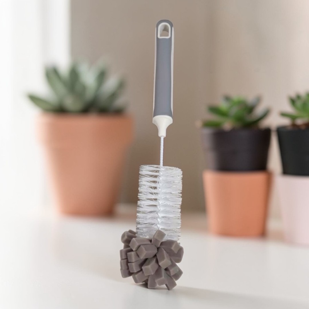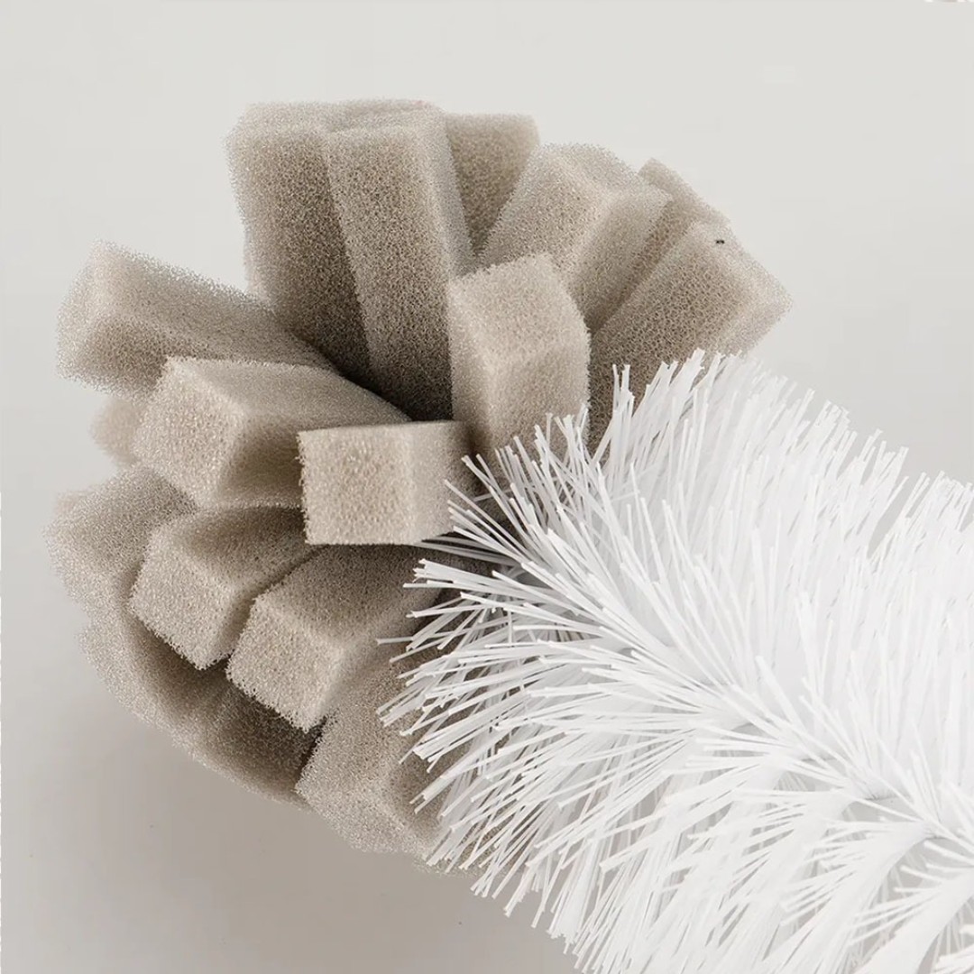 تنظيف فعال بزاوية 360°: الفرشاة الأسطوانية الطويلة تصل إلى جميع الزوايا داخل الزجاجة، بينما تتعامل الإسفنجة مع البقايا العنيدة في القاع.