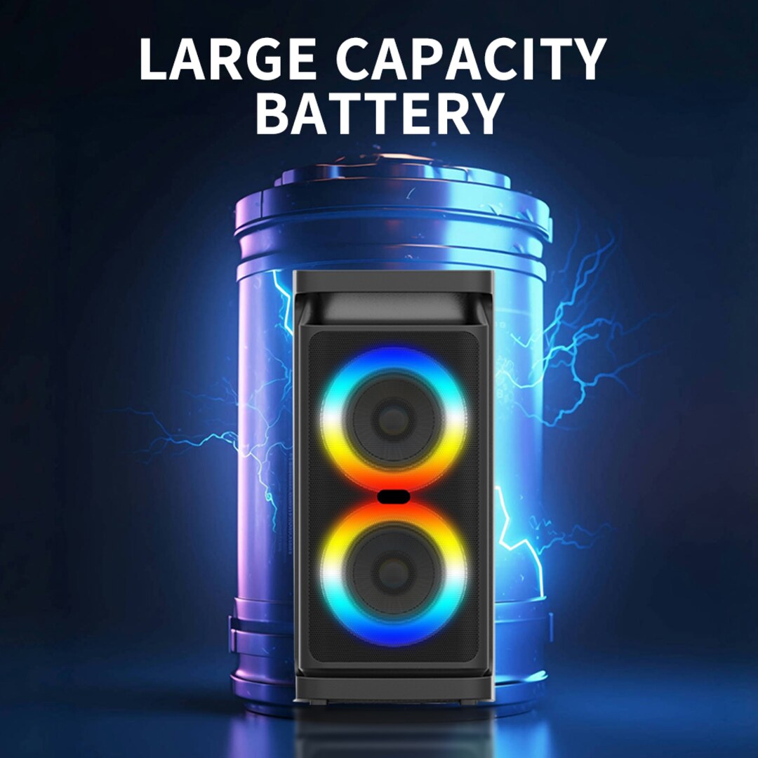 صوت قوي عالي الأداء: مزودة بسماعتين لتقديم صوت قوي وواضح وغني، مثالي للاستخدام الداخلي والخارجي والحفلات والتجمعات.