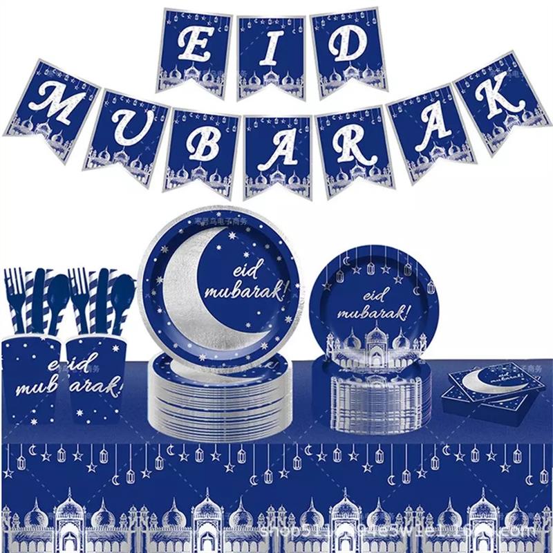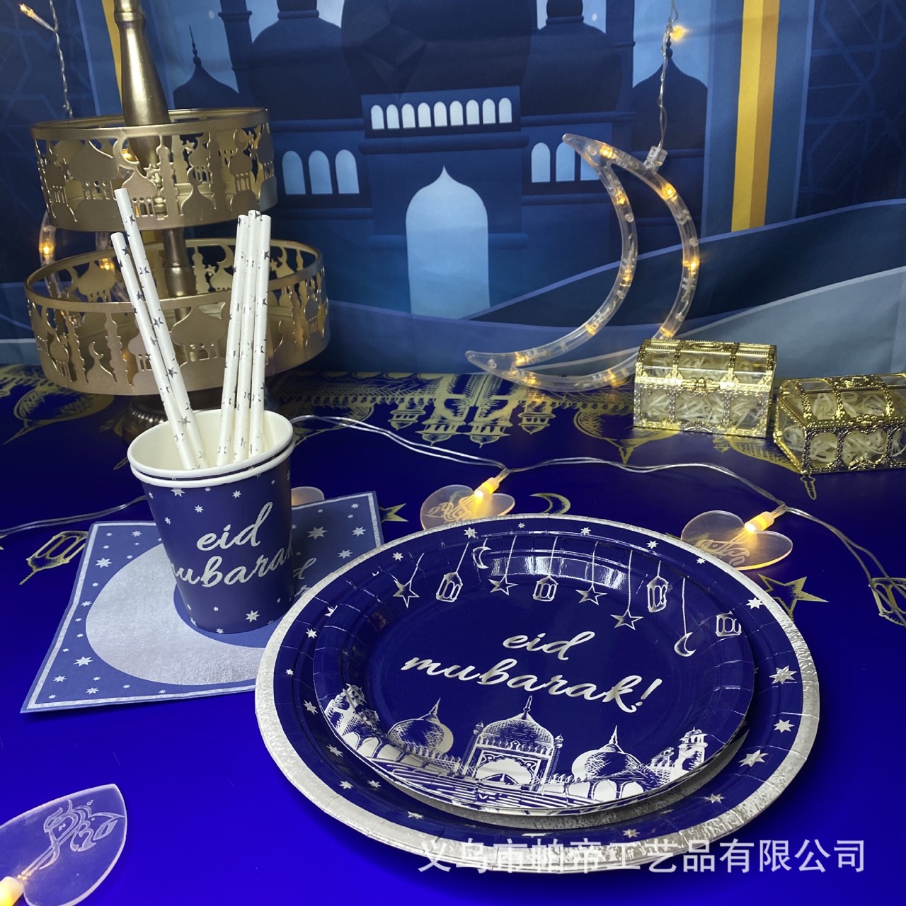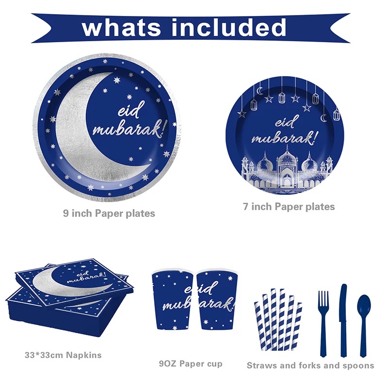 Fancy Elegant Design: Our Eid Mubarak decoration table set designed with blue background and attractive silver pattern. perfect for Eid Mubarak party.