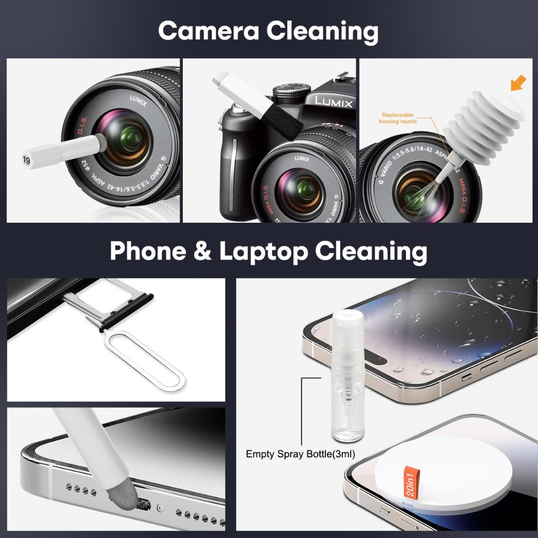 Contains various cleaning tools, such as large cleaning brushes, screen cleaning cloths, dust blowers, etc., for more comprehensive cleaning.