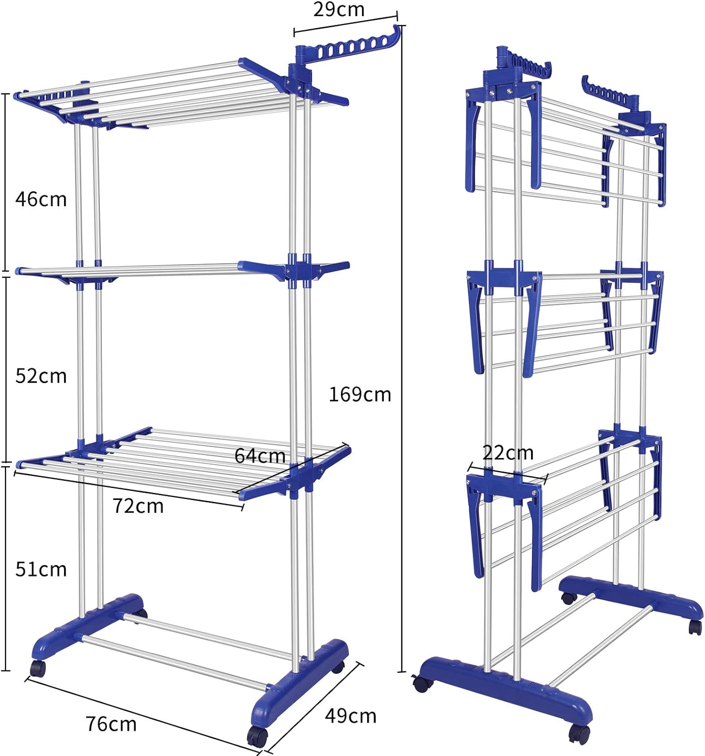 Perfect Space Design: The laundry drying rack is different from the general vertical dryer rack, the 3-tier space in the middle of the hanger is composed of 6 retractable trays and the top is composed of 2 rotatable side wings, which can use the maximum capacity to store foldable clothes. The trays can also be folded, and you can hang longer suits or dresses.