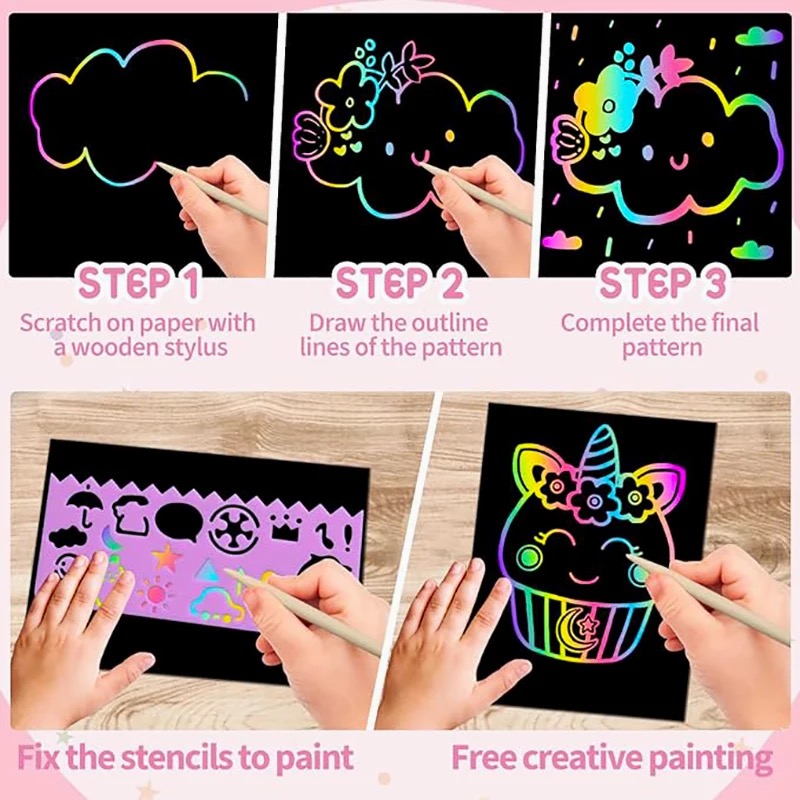 Educational Toys: Kids can draw a variety of patterns by limitless imagination to stimulate their infinite creativity by using the rainbow scratch paper, also a very good way to train kids hands-on skills, intelligence development