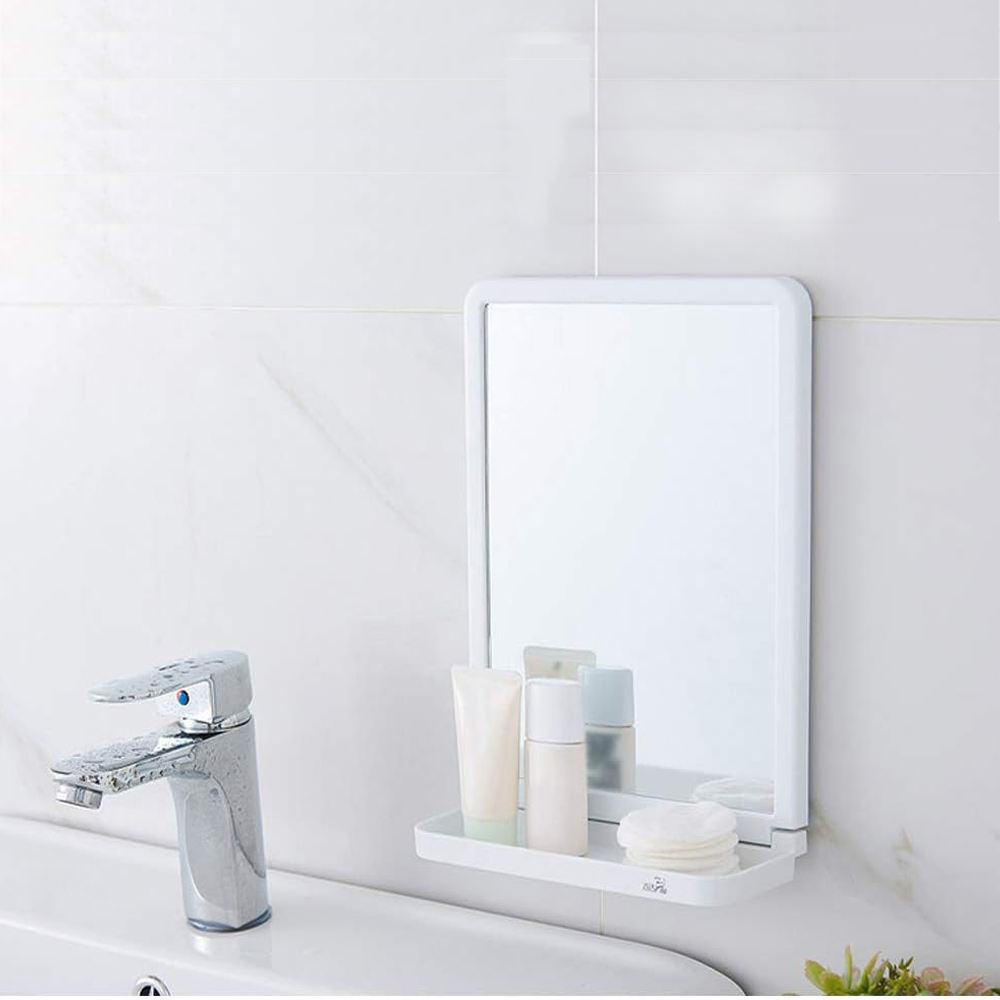Integrated Mirror & Shelf Design: Rectangular bathroom mirror combined with a practical built-in shelf for holding daily essentials such as soap, toothbrushes, or skincare items.