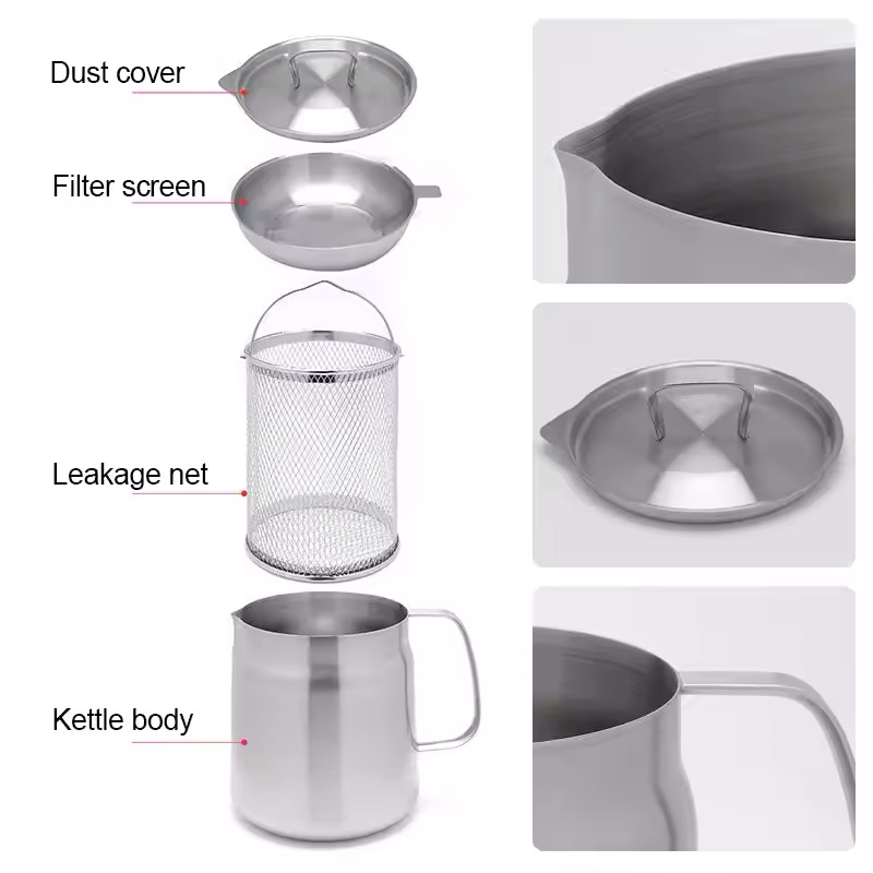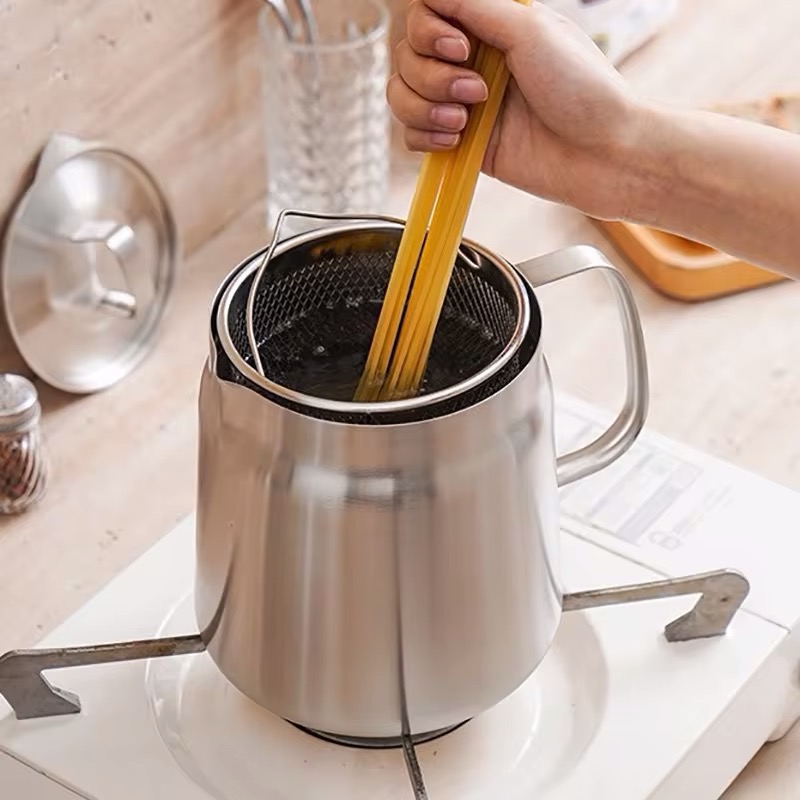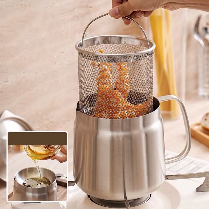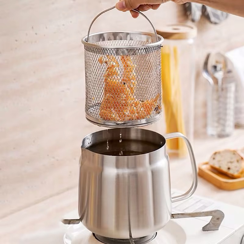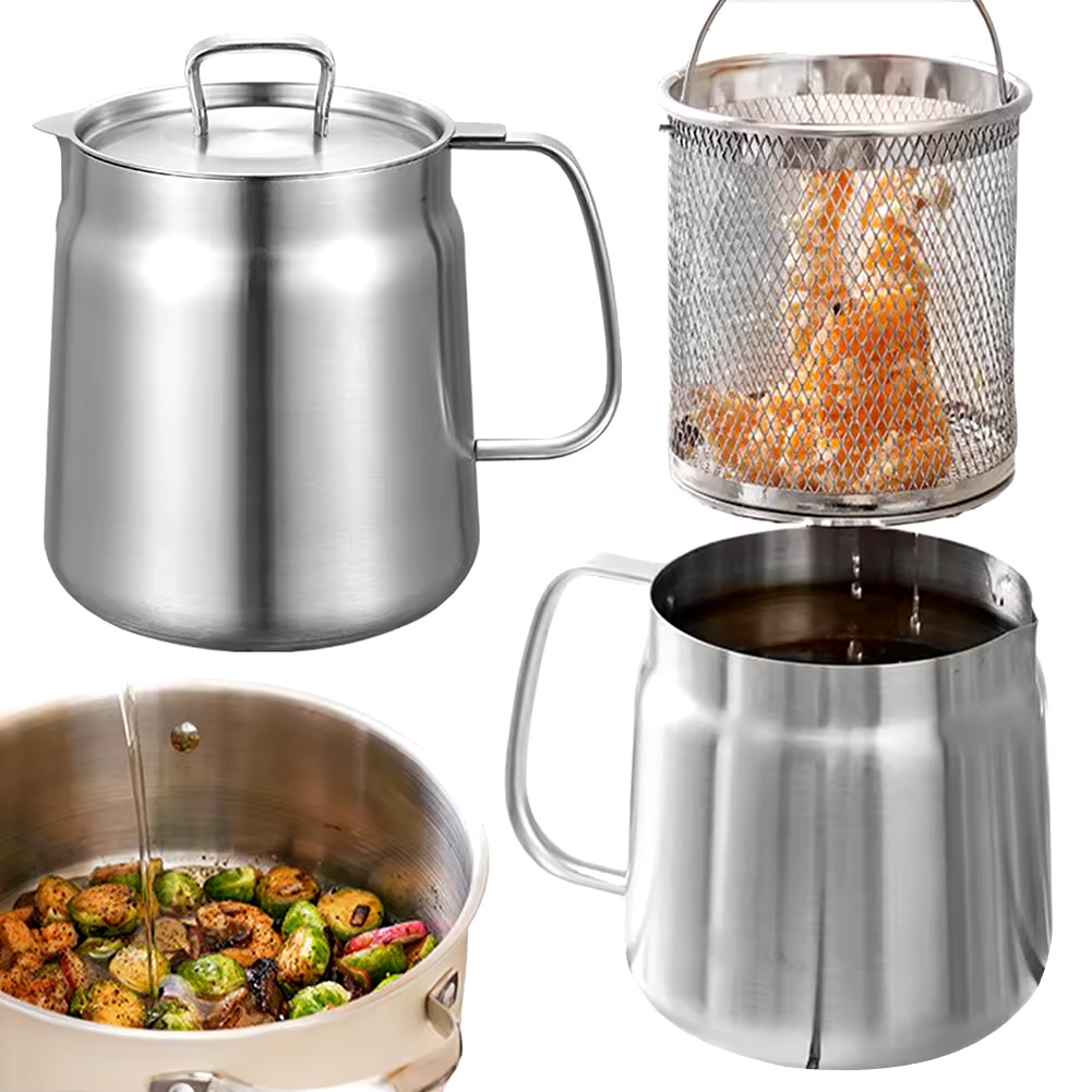 3. The stainless-steel oil filter jug ​​can filter used cooking oil, and can also be used as a storage container to ensure that the oil is effectively preserved for future use and reduce waste. The matching frying basket design allows for easy frying, making it an indispensable tool for simplified cooking.