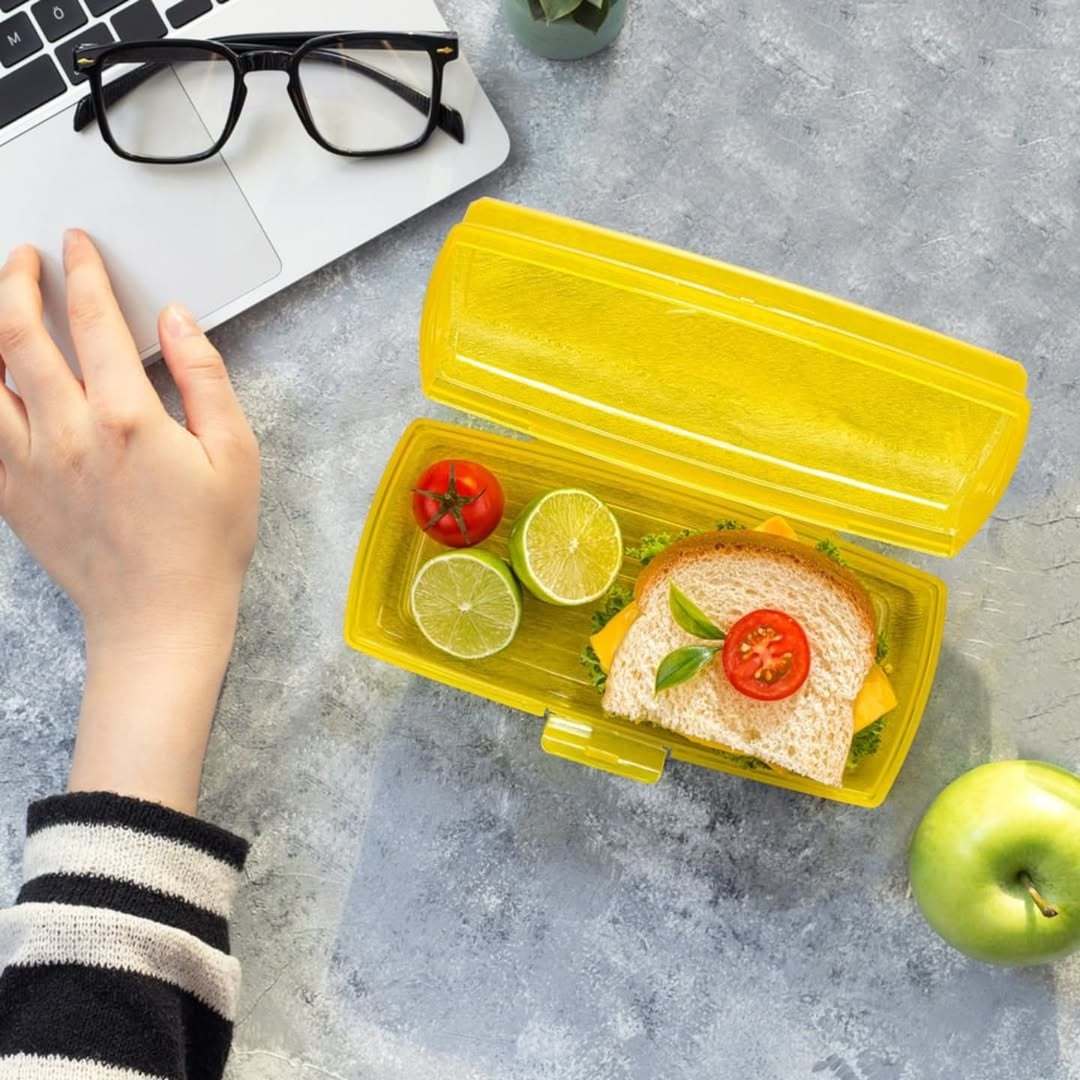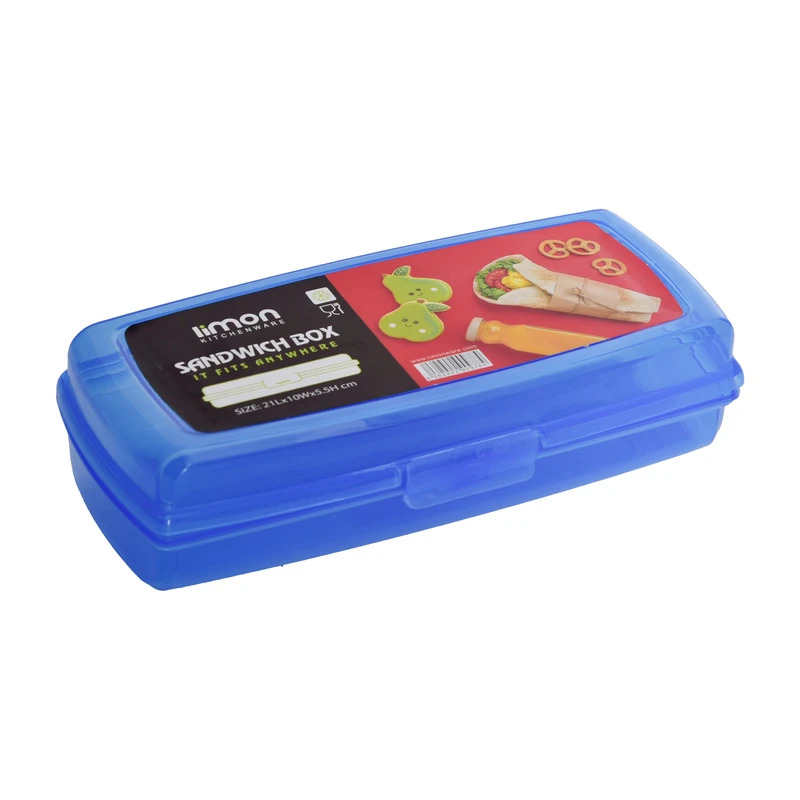 Compact Design: Sandwich container (21x10x5.5 cm) in vibrant colors – pink, blue, yellow, and orange.