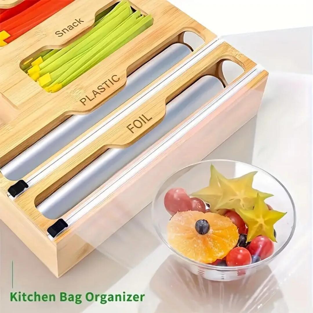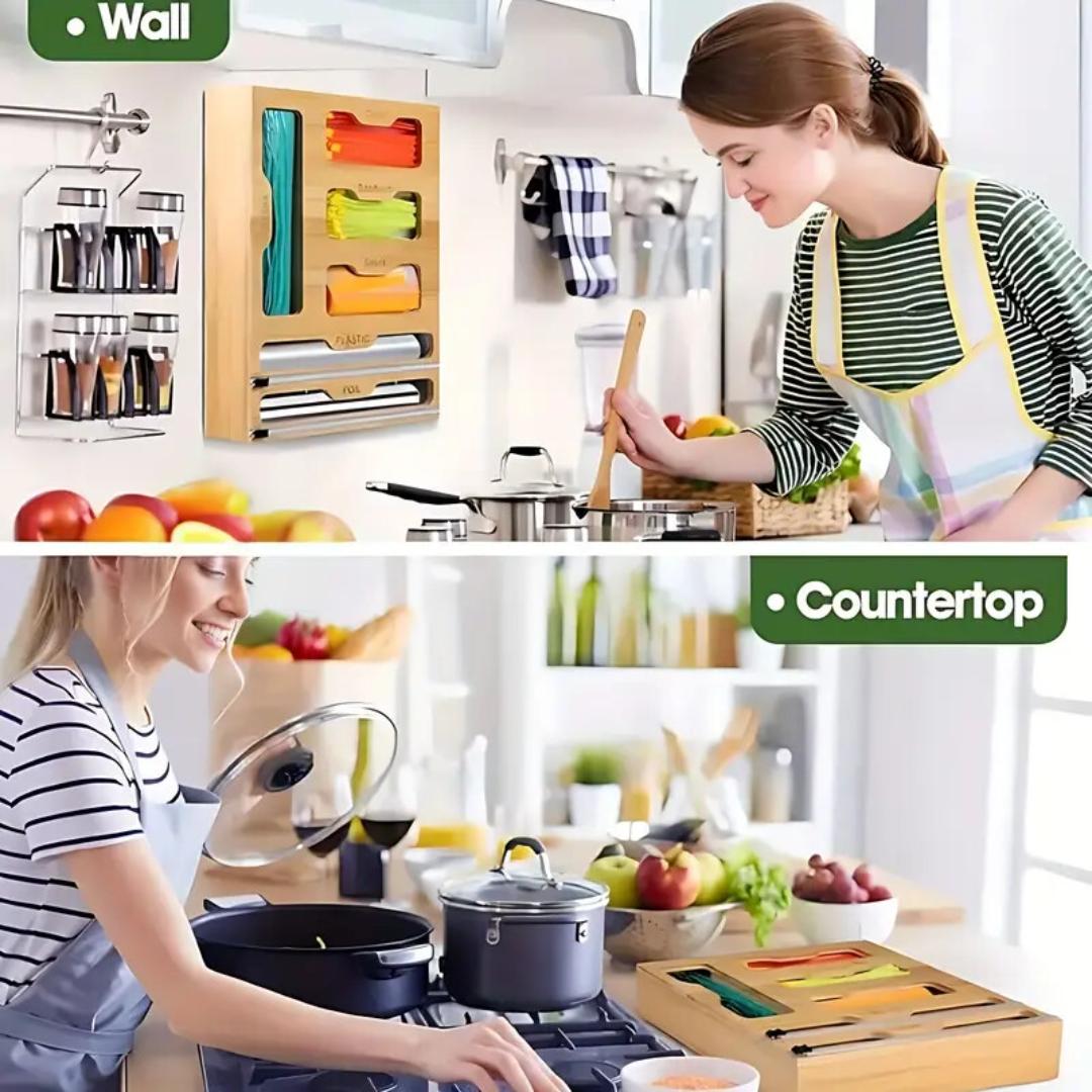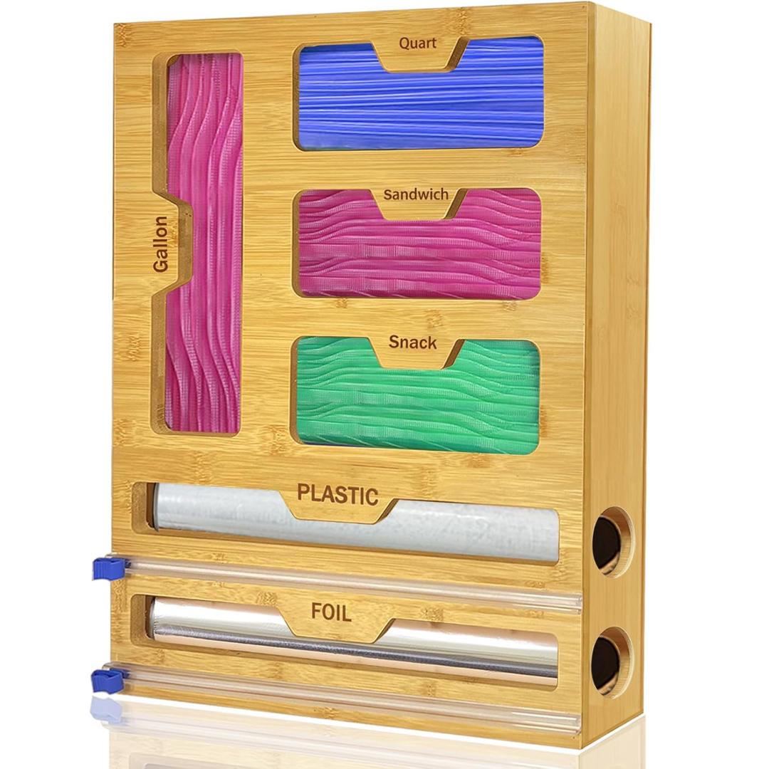6-in-1 Versatile Storage: Designed with 6 compartments, including 4 dedicated to different ziplock bag sizes—snack, sandwich, quart, and gallon—and 2 with built-in cutters, perfect for foil, plastic wrap, or parchment paper. (Note: Fits wrap rolls ≤12" long and ≤2" in diameter.)