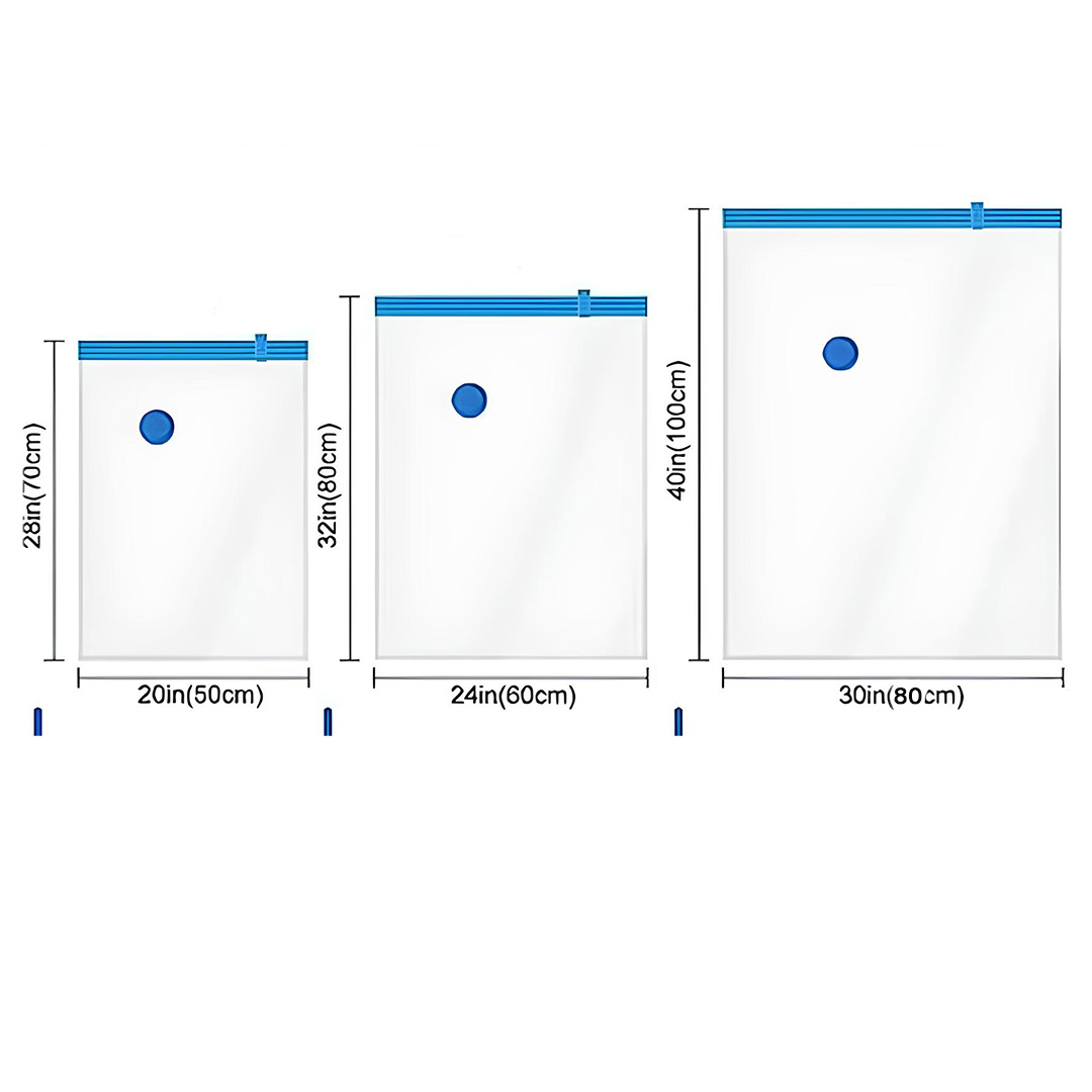 Versatile Size Set (5Bags + Pump) – Includes 2 small  (50x70cm), 2 medium (80x60cm), 1 large (100X80 cm) bags, plus a manual pump—ideal for clothes, bedding, duvets, towels, and more.