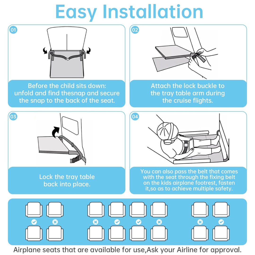 Easy to Set Up – Installs quickly by attaching to the seat tray and armrest using adjustable straps and zippers, transforming into a secure toddler airplane bed.