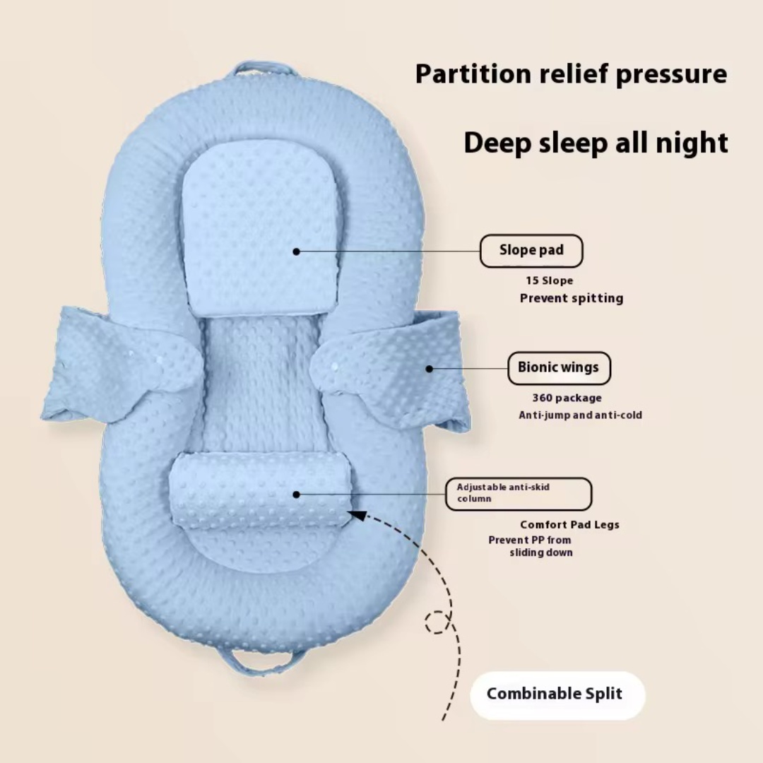 Multifunctional Design – This baby bed serves multiple purposes: anti-spitting milk with a 15° slope, promotes restful sleep, supports sitting posture for learning, and helps babies lift their heads during tummy time (ideal for 3–6 months).