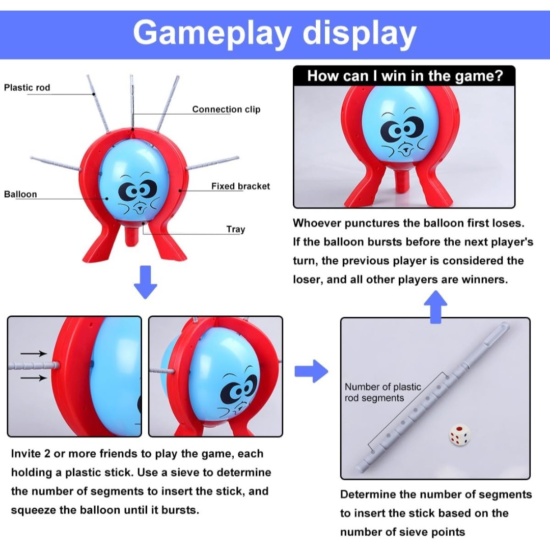 Thrilling Gameplay – Players roll the dice and push sticks into the balloon frame based on the number rolled, building suspense with every turn.