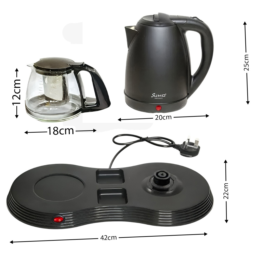 Elegant 2-in-1 Design: Includes a 1.8L stainless steel electric kettle and a glass teapot with infuser, perfect for brewing tea or boiling water simultaneously.