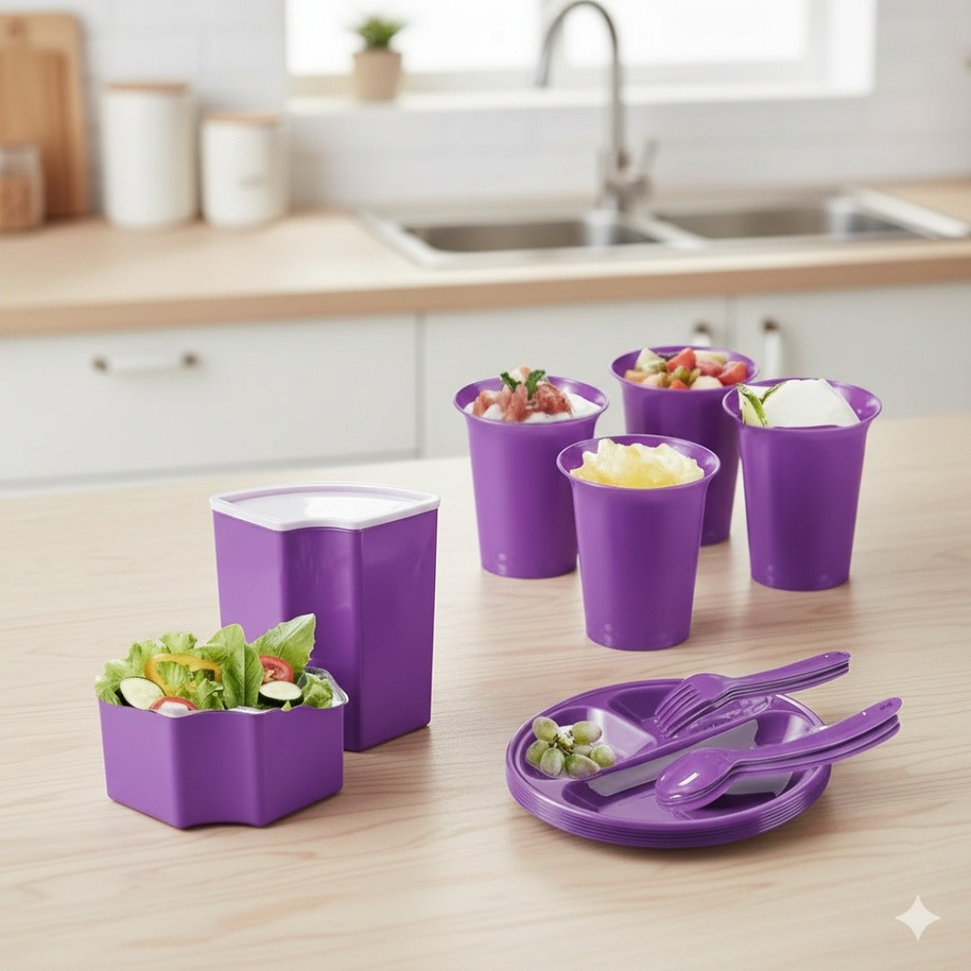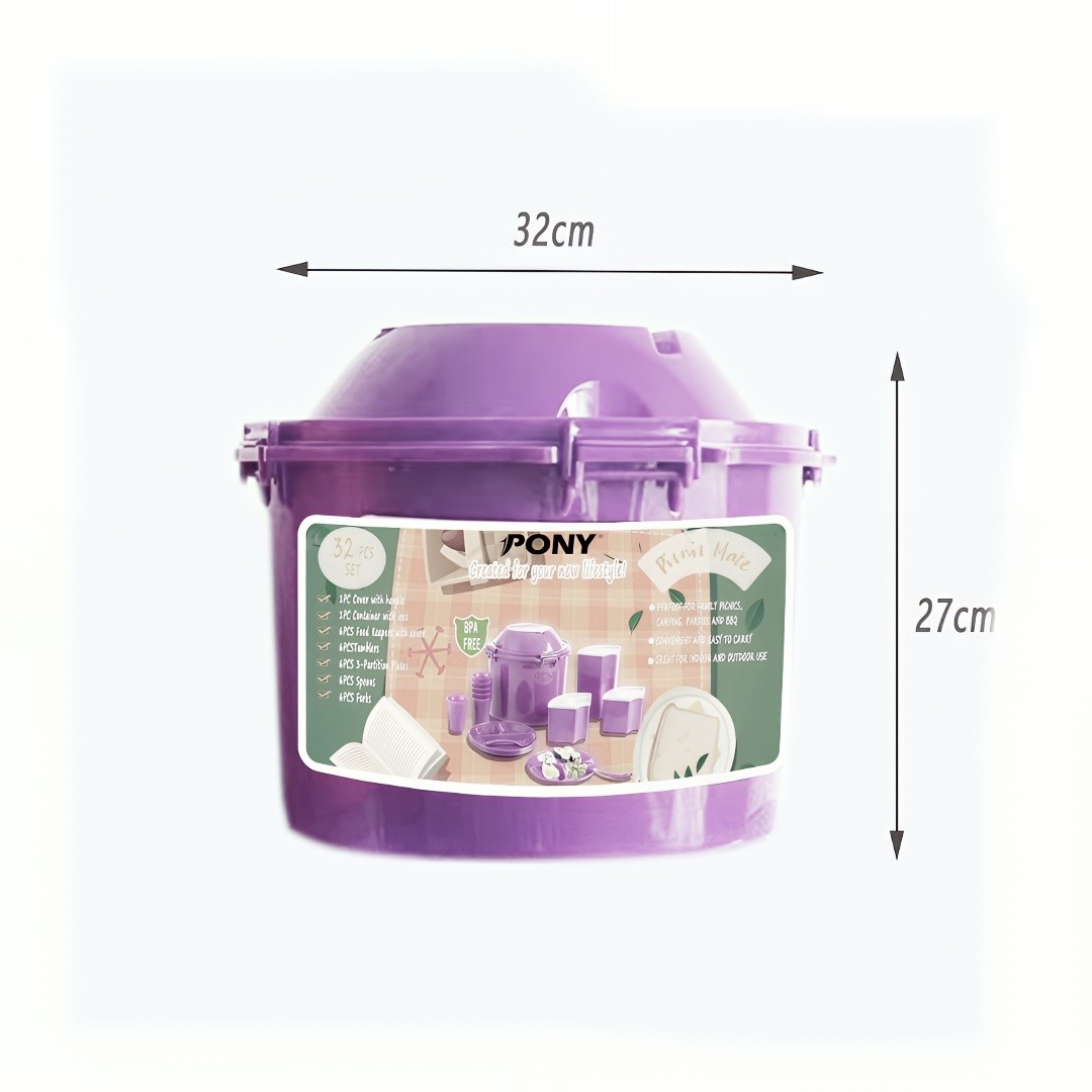 32PCS Complete Set: Includes 6 plates with partition, 6 cups, 6 spoons, 6 forks, 6 storage bins with lids, 1 cover with handle, and 1 locking container for full outdoor dining convenience.