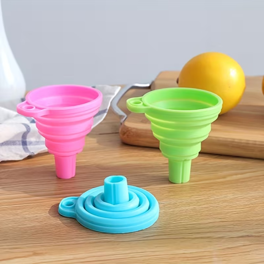Collapsible Silicone Funnel Set: Foldable, compact design saves space and fits easily in drawers, bags, or kitchen organizers.
