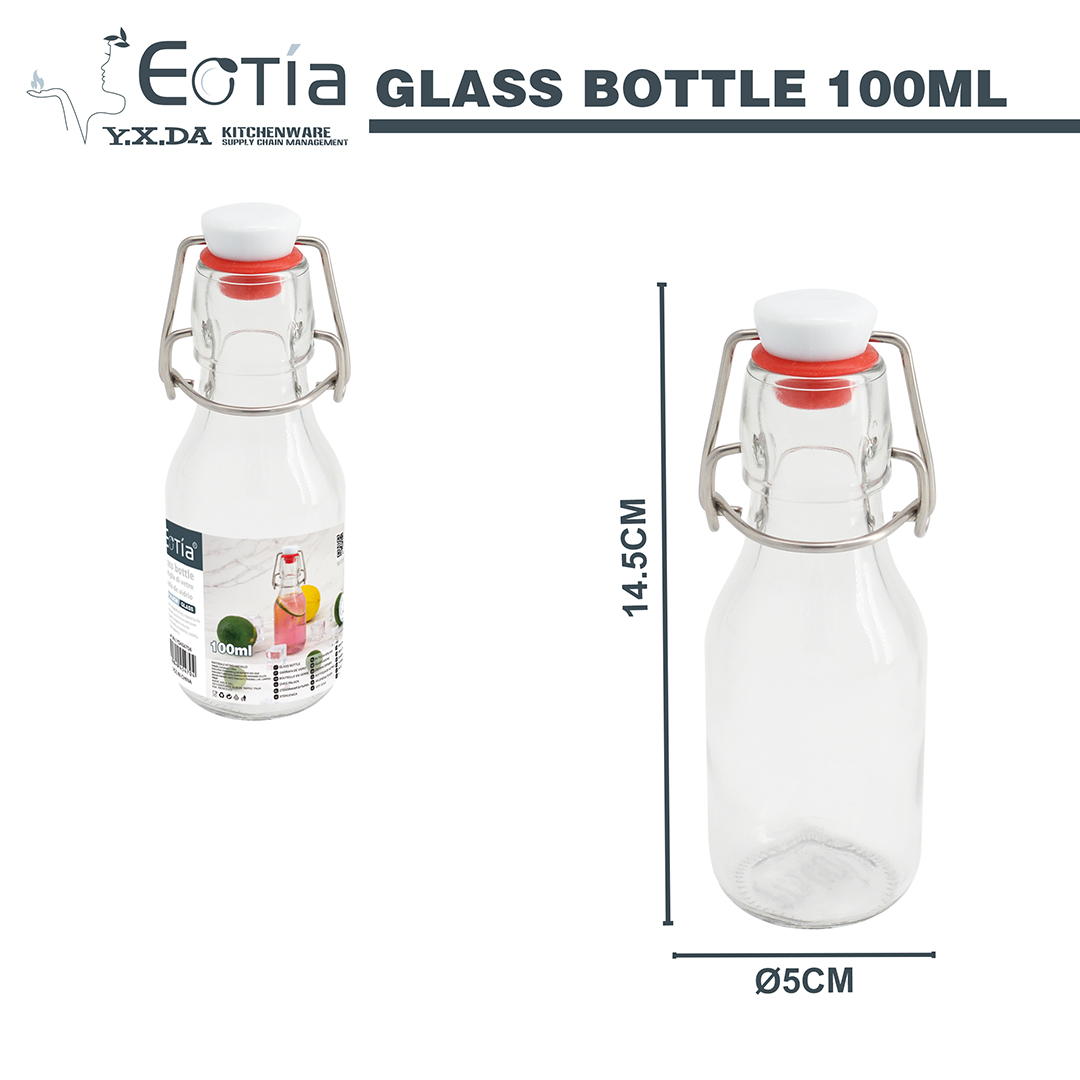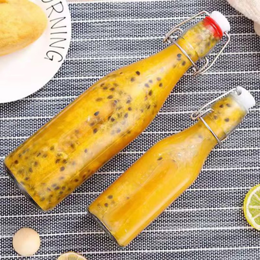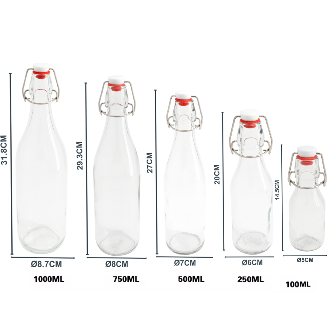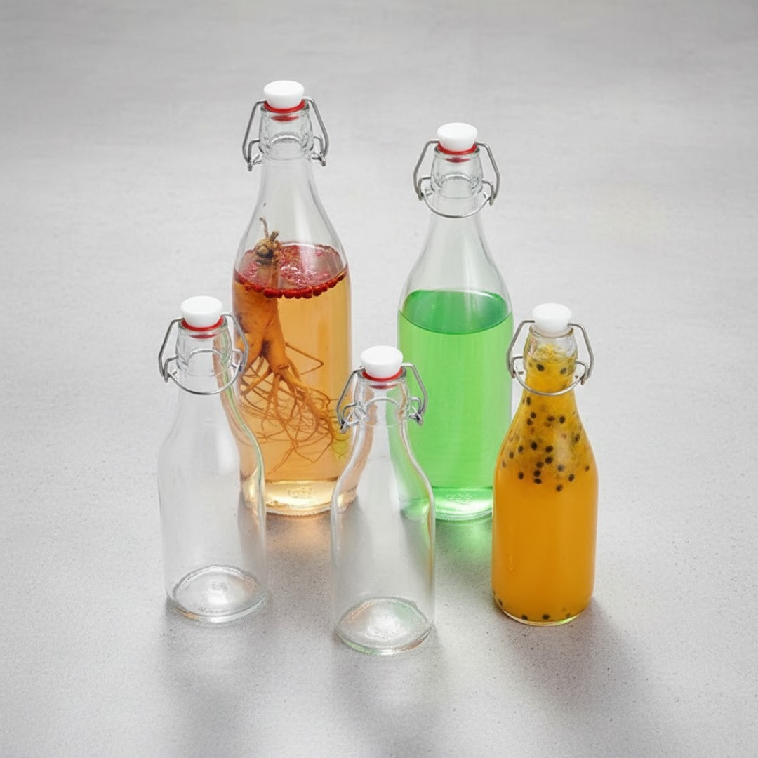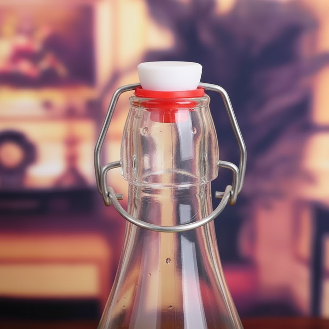 Clear Glass Swing-Top Bottle: Designed for storing beverages with an airtight and leak-proof seal.